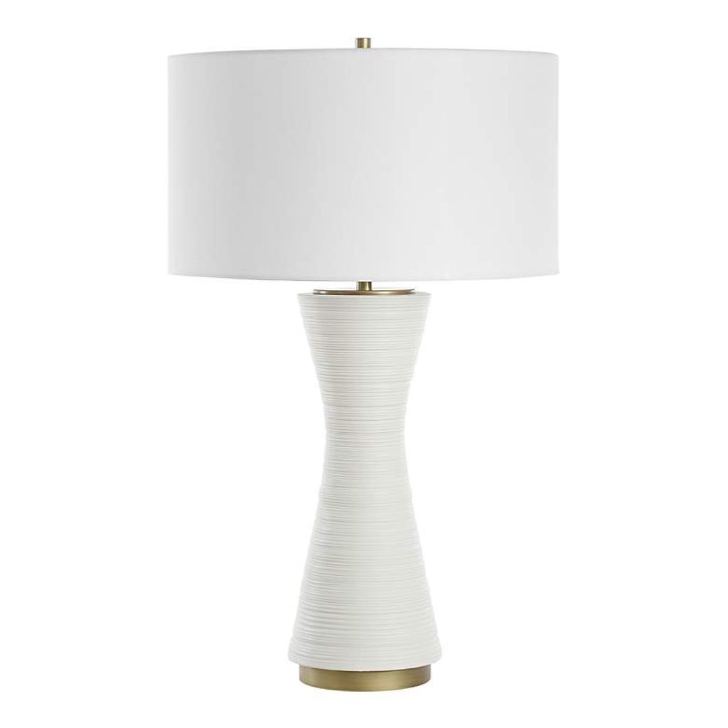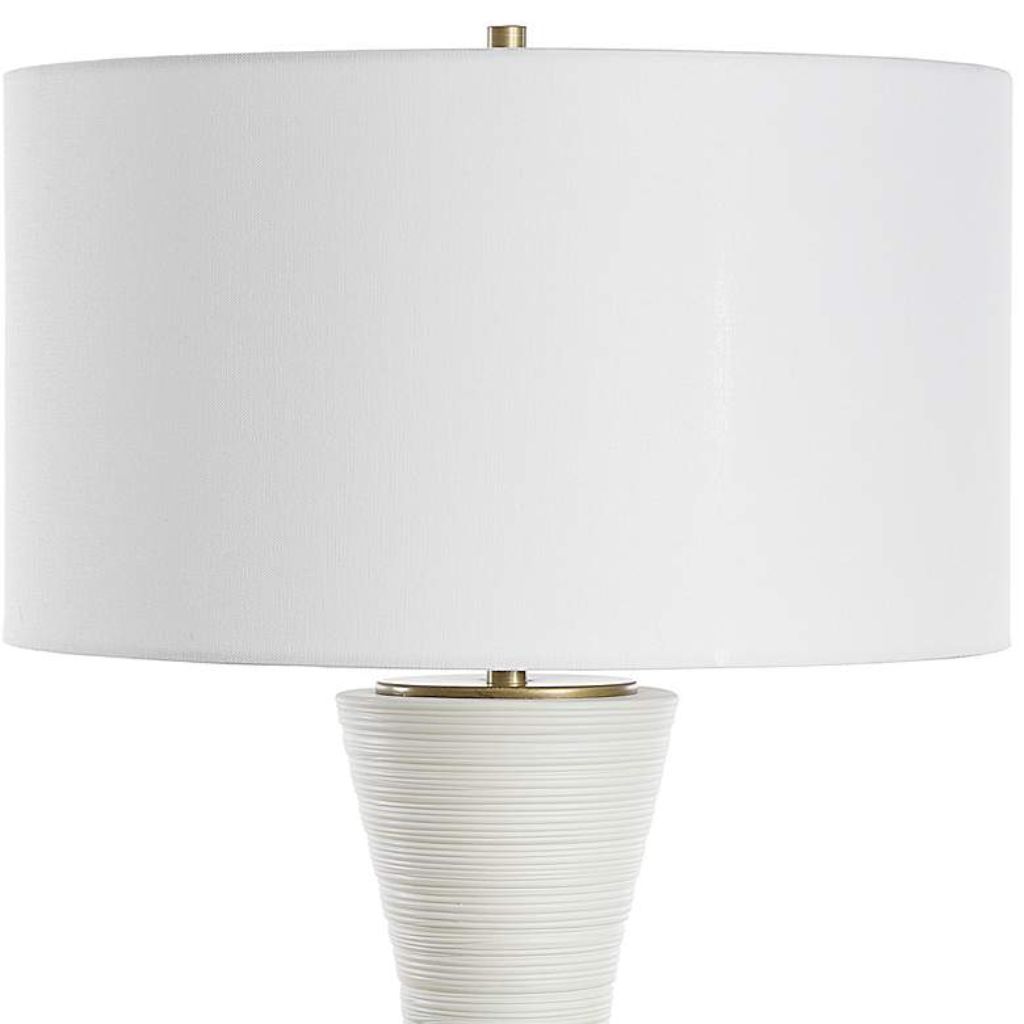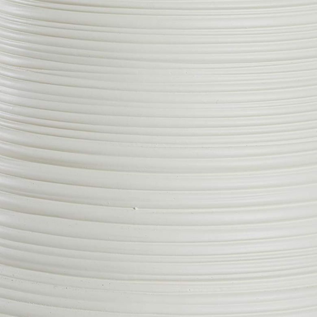 The lamp features a 6-inch wide base crafted from durable ceramic with a smooth matte finish. Its cylindrical silhouette and minimalist profile provide an elegant foundation, making it suitable for modern, contemporary, or transitional interiors.