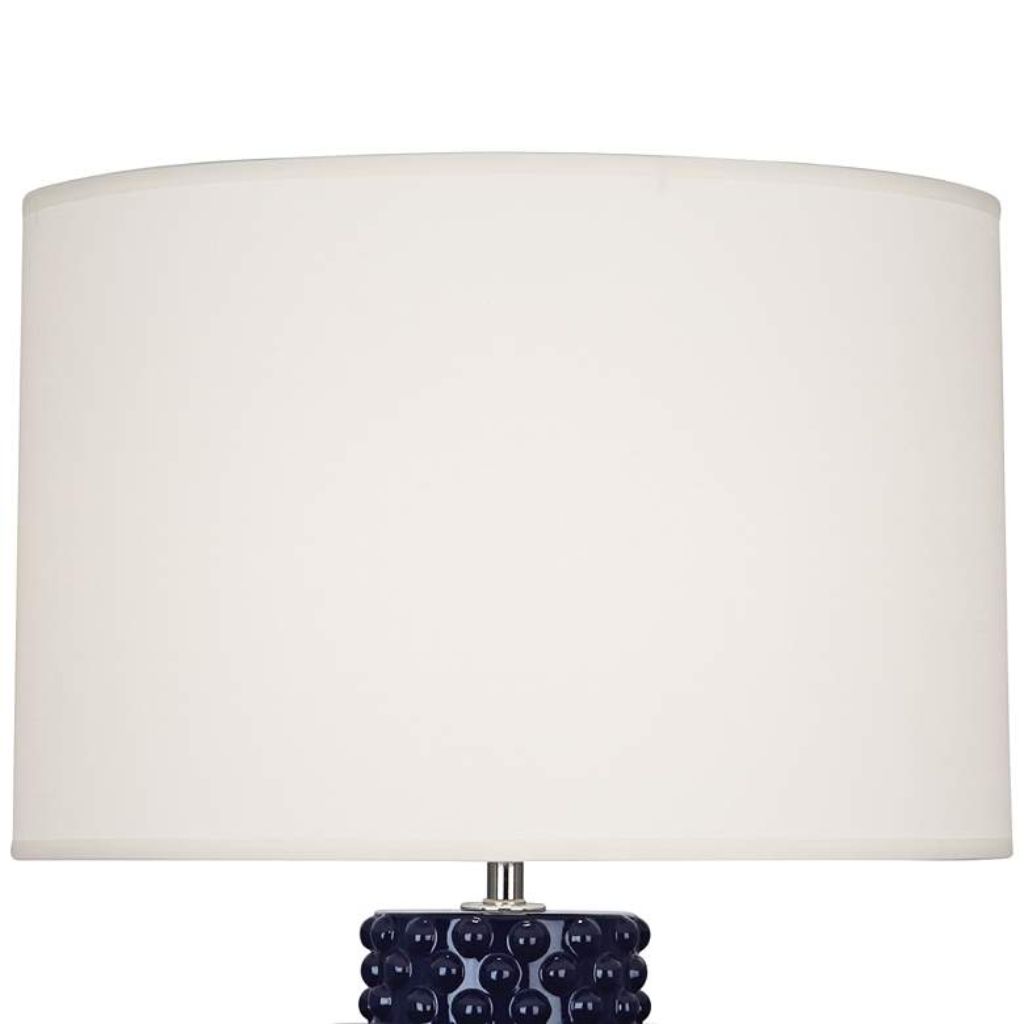 Built in the USA from ceramic, this ceramic table lamp carries a midnight blue finish that is deep and saturated without crossing into harsh or overpowering territory. The fondine fabric drum shade sits proportionally over the base, adding a traditional softness that balances the richness of the color below.