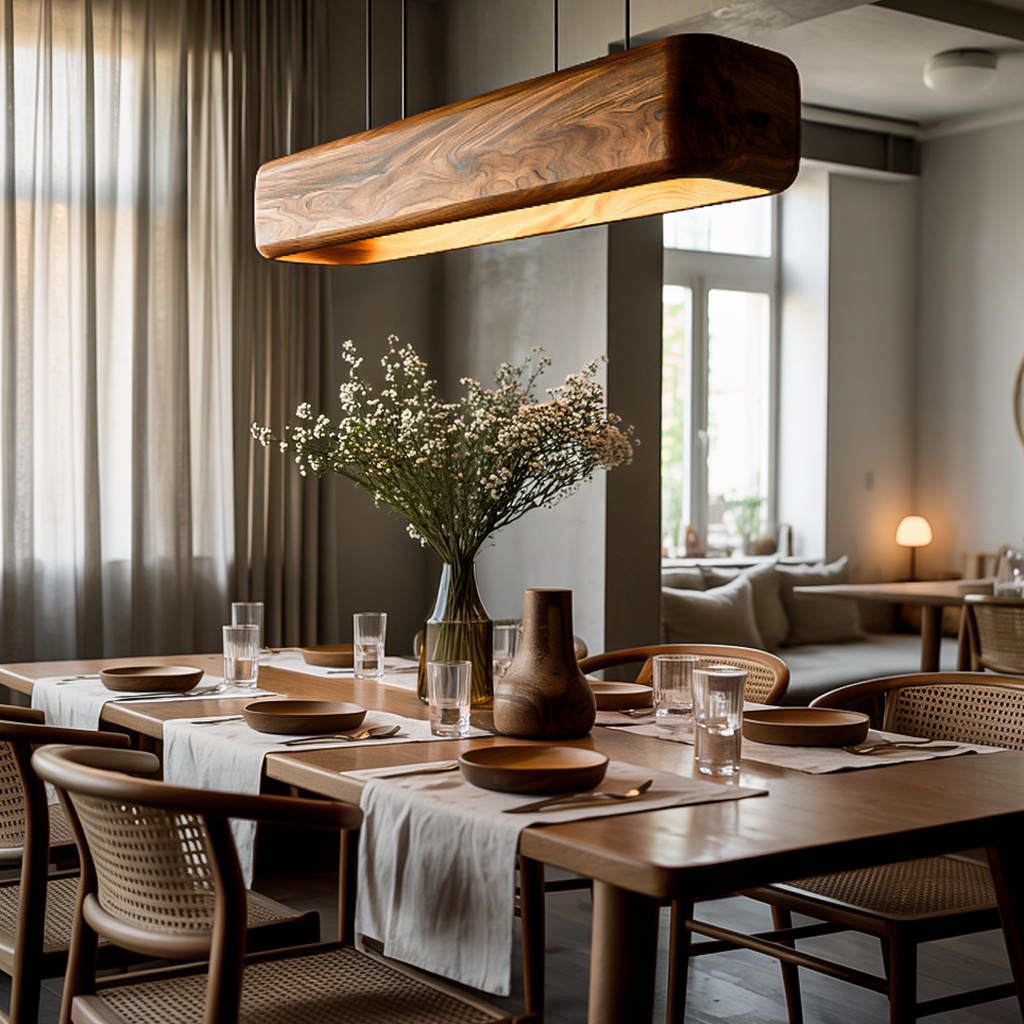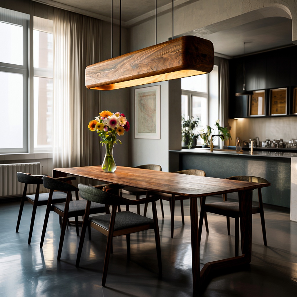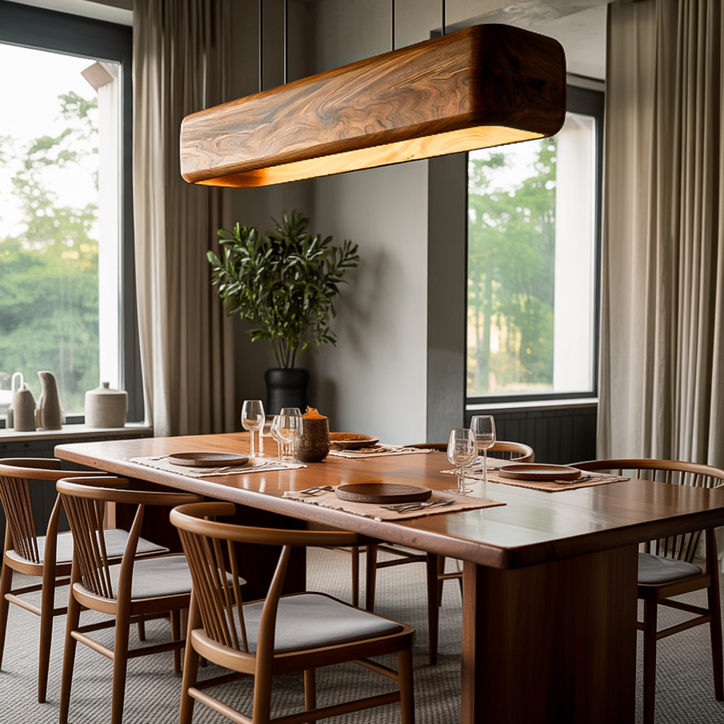 This ceiling light is crafted with a smooth, rounded rectangular shape, suspended by slim cables that give it an airy feel. The light source is cleverly hidden along the underside, providing even illumination that highlights your dining surface. Its streamlined look minimizes visual clutter, allowing the natural beauty of the wood grain to shine through.