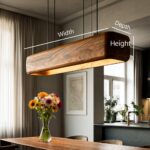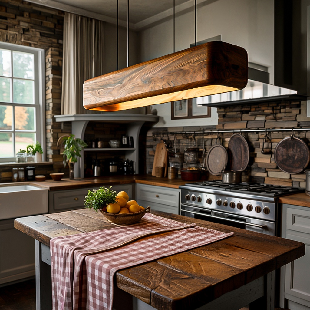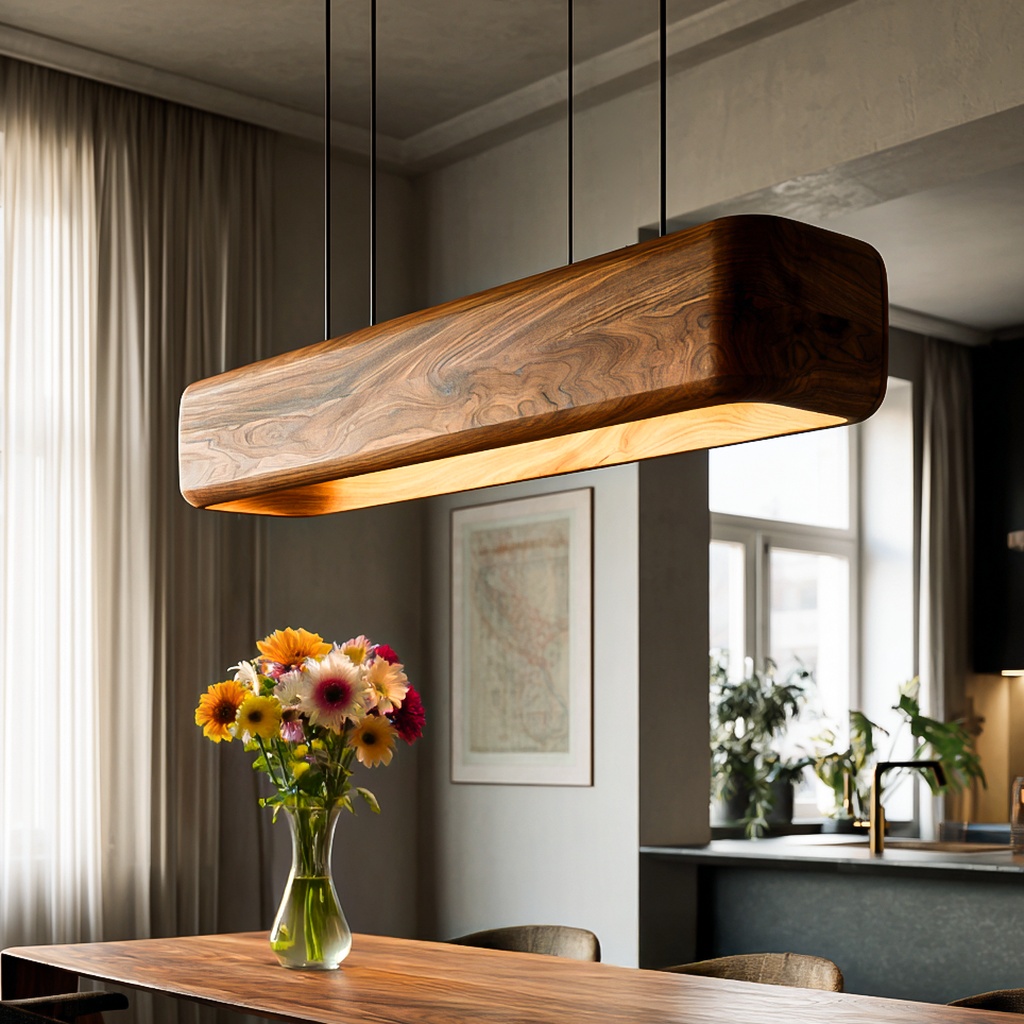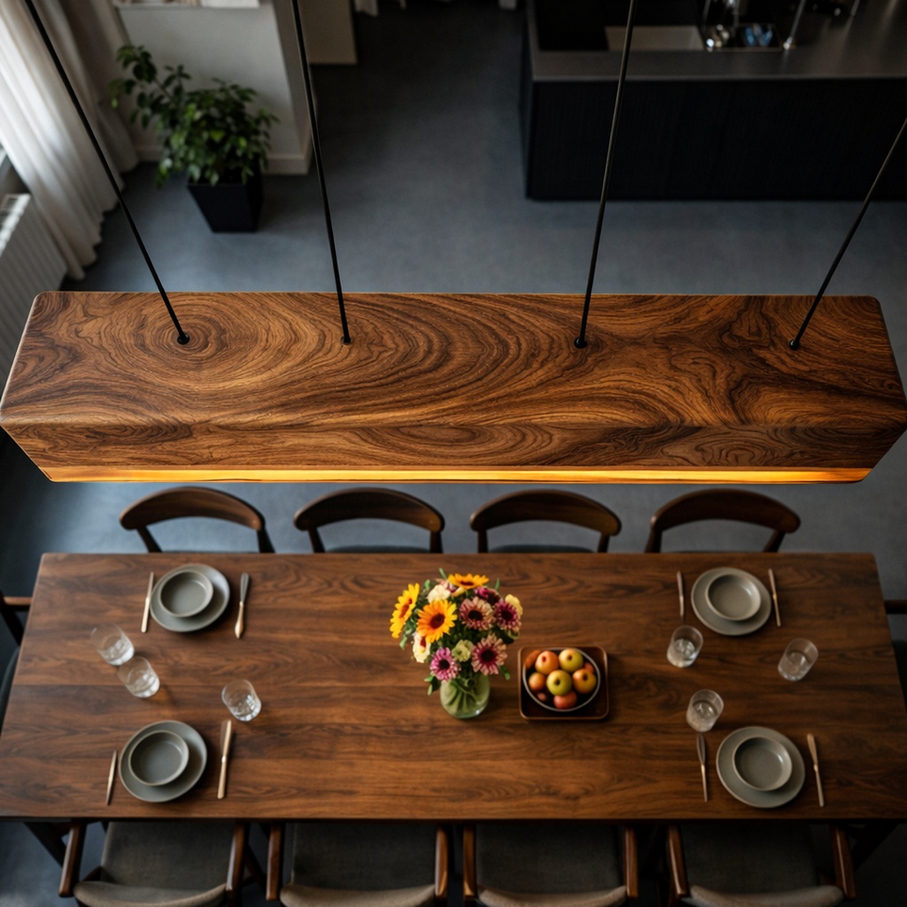 This ceiling light is crafted with a smooth, rounded rectangular shape, suspended by slim cables that give it an airy feel. The light source is cleverly hidden along the underside, providing even illumination that highlights your dining surface. Its streamlined look minimizes visual clutter, allowing the natural beauty of the wood grain to shine through.