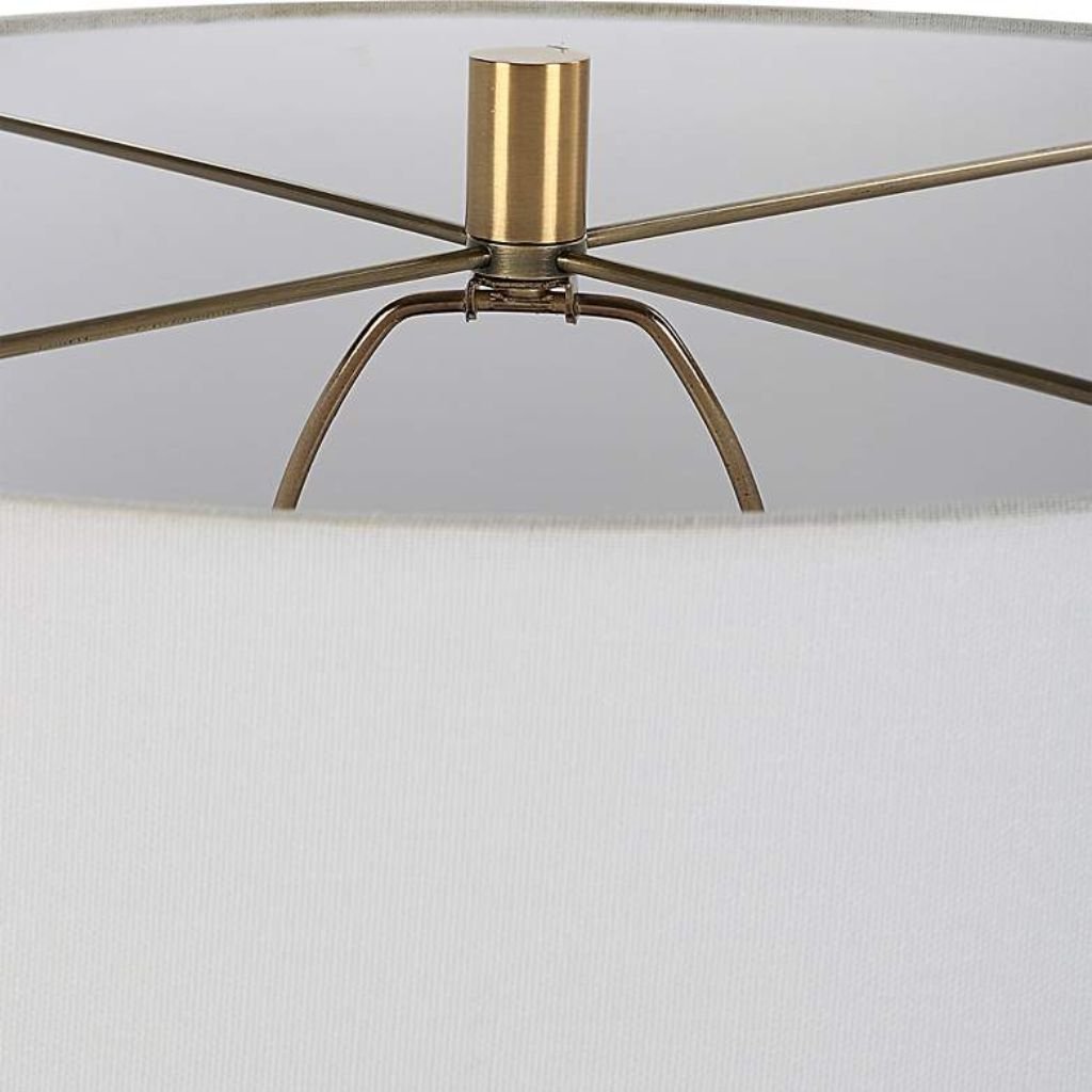 Topped with a crisp white fabric shade, the lamp softly diffuses light for a warm, inviting glow. Compatible with standard-base bulbs (not included), it combines functionality with visual artistry.