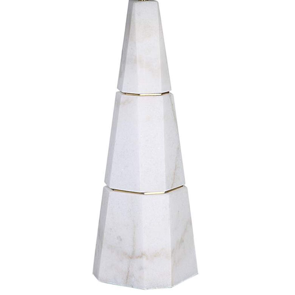 At 28.75 inches tall with a base measuring 5.5 inches wide and 5.5 inches deep, the Citadel is proportioned for nightstands, end tables, and console surfaces where a narrow footprint and tall vertical profile are equally important. The elongated 17-inch shade height reinforces that verticality, making the lamp read as tall and architecturally deliberate rather than simply functional. At 9 pounds, the marble base provides solid, stable footing without being difficult to reposition when needed. The included 7-foot cord offers generous reach from outlet to surface in most standard room configurations.