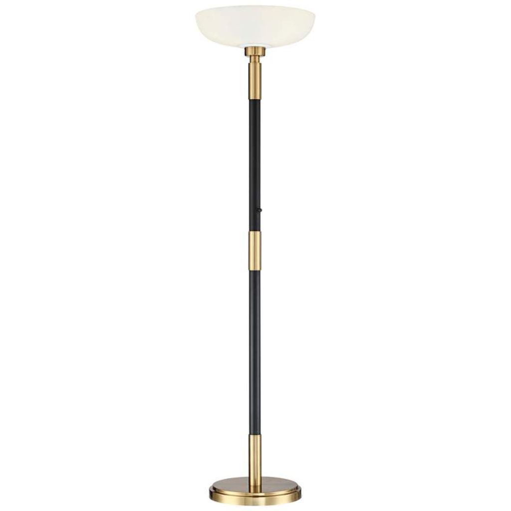 This torchiere floor lamp features a bold mixed-metals look, combining warm antique gold and matte black finishes for a visually dynamic effect. The alternating finishes add depth and contrast, giving the lamp a modern yet timeless appeal. Crafted from durable metal, the design offers long-lasting stability and a substantial feel, enhanced by its solid, weighted base.