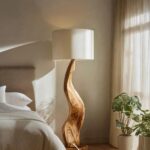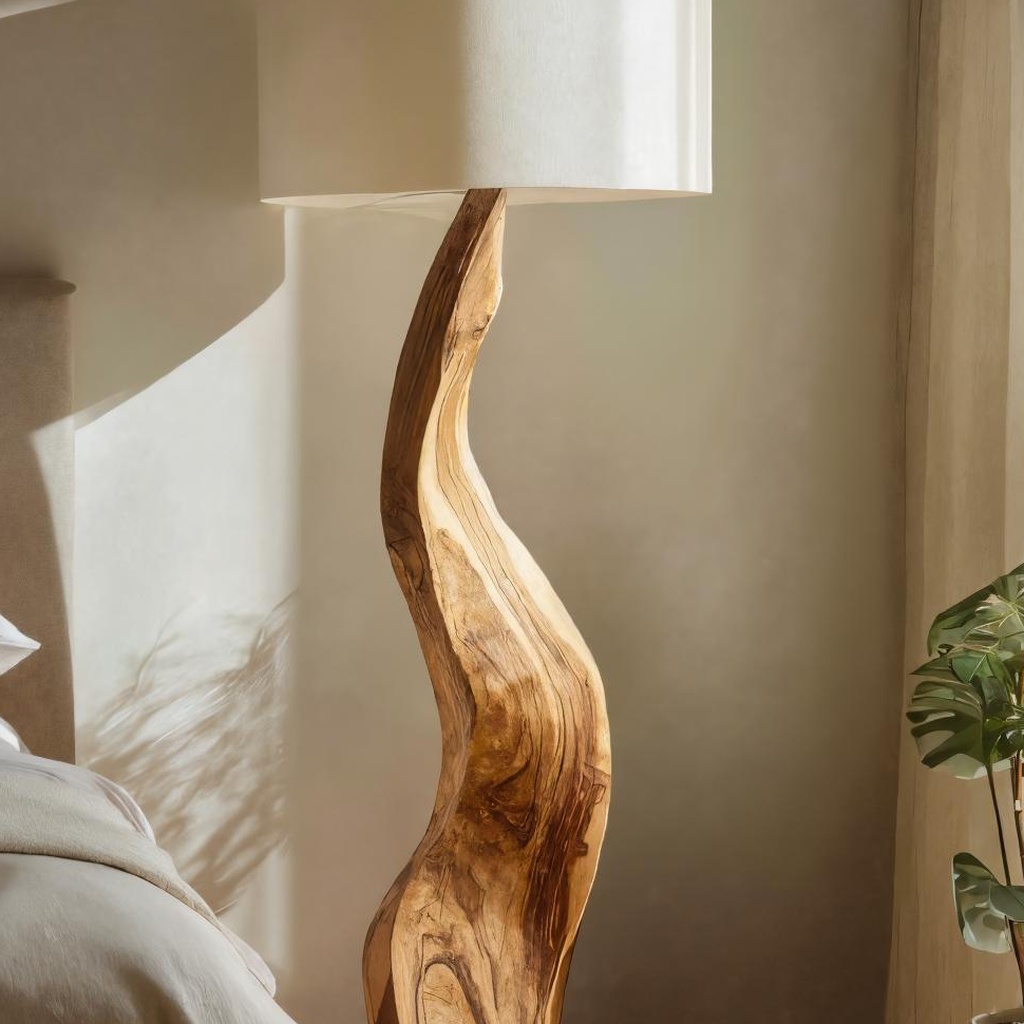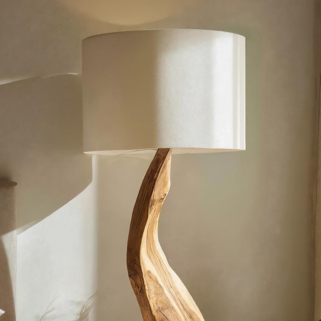 This lamp works across a range of spaces and styles. In a bedroom, it functions as a warm secondary light source that softens the overall atmosphere. In a living room, it holds its own as a focal point — something guests will notice and ask about. It also fits well in reading nooks, creative studios, boutique hotel rooms, and open-plan interiors where natural materials and considered design are part of the overall language. Stylistically, it aligns with modern organic, Japandi, Scandinavian, and contemporary rustic interiors. It pairs naturally with linen, stone, rattan, and other honest, tactile materials. If your space leans toward warm neutrals and natural textures, this lamp will feel right at home without needing to be styled around. Modern sculptural floor lamp with curved base, offering artistic design and soft ambient lighting to elevate contemporary living spaces.