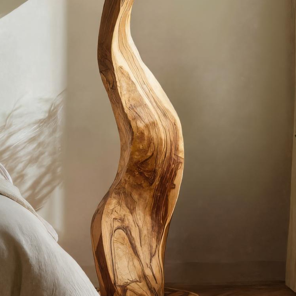 This lamp is made to order, which means it isn’t pulled from a shelf of identical units. Each one is shaped individually, and the natural wood used means genuine variation in texture, grain pattern, and tone from lamp to lamp. One piece might show a tighter, straighter grain; another might carry more figure or a slightly richer color. These differences are what give the lamp its character and ensure that yours is genuinely one of a kind. The finish preserves the wood’s raw, organic appeal rather than smoothing it into something overly refined or artificial. Modern sculptural floor lamp with curved base, offering artistic design and soft ambient lighting to elevate contemporary living spaces.
