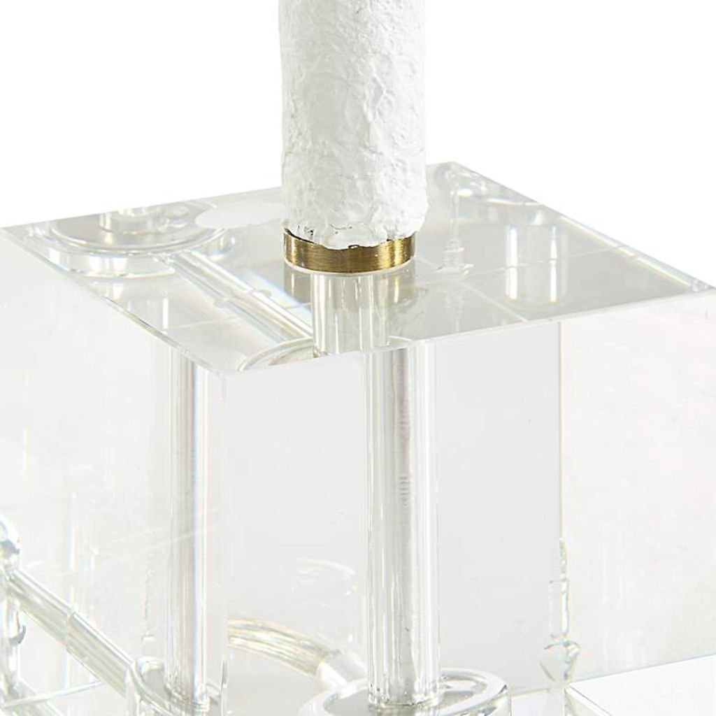 The Helena lamp features a slender, tall ceramic base finished in matte white, emphasizing its elegant, organic curves. At the very bottom, a square crystal accent adds a subtle touch of sophistication, enhancing the lamp’s contemporary aesthetic. The 3 1/2-inch wide base ensures a sleek footprint while maintaining stability.