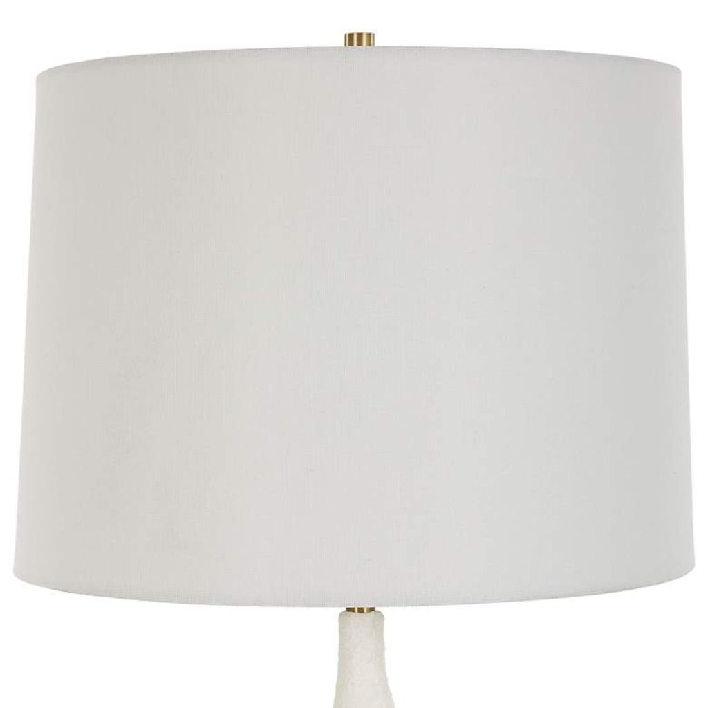 Crowning the artistic base is a white linen fabric shade measuring 14 inches across the top and bottom and 10 inches high. This shade diffuses light softly, creating a warm and inviting glow while complementing the minimalist ceramic form.