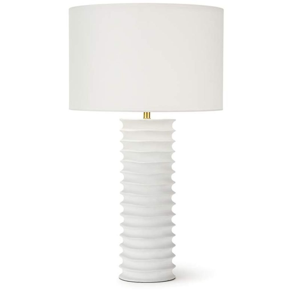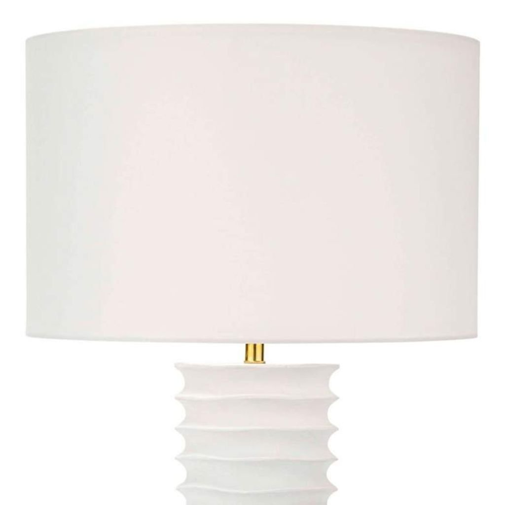 Built from aluminum with an accordion-like textured surface, this column lamp brings together artisanal craftsmanship and clean modern form in a crisp white finish that works across a wide range of interior styles. A natural linen drum shade sits atop the columnar base, softening the lamp’s structured geometry with warm, diffused light.