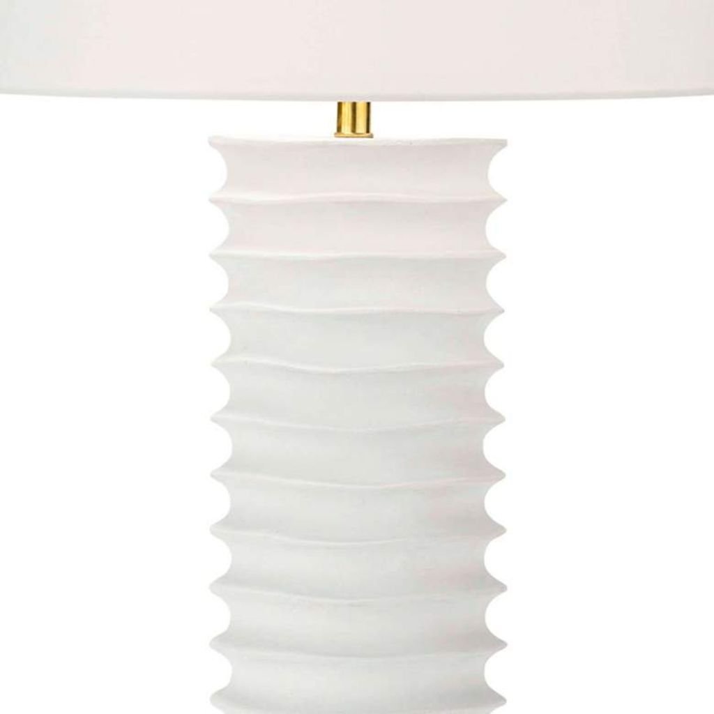 The accordion-pleated texture running the length of the aluminum column is what makes this lamp visually interesting at close range — it catches light across each ridge and recess, giving an otherwise simple white base genuine surface depth. The crisp white finish keeps the overall look fresh and versatile rather than cold or industrial.