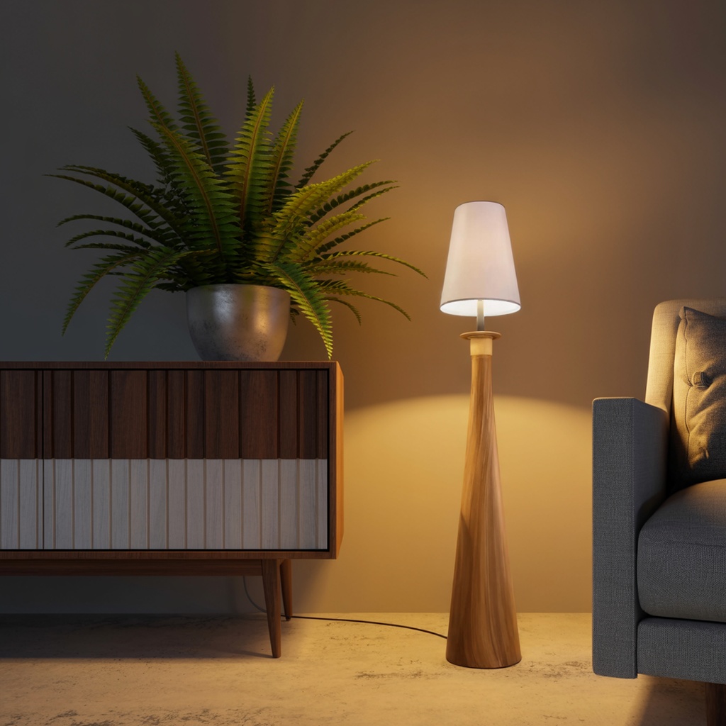 These floor lamps are crafted with a sleek, tapered base made from solid wood, topped with a minimalist fabric shade. The clean lines and elegant cone-like shape fit seamlessly into various decor styles, whether it’s modern, Scandinavian, mid-century, or Japandi. They not only provide light but also serve as a striking visual element in any room.