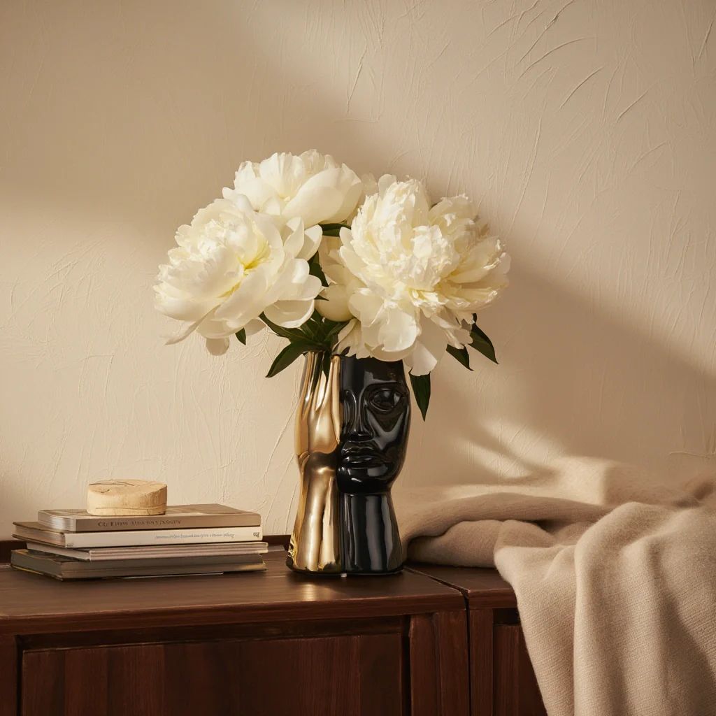 This sculptural vase merges a deeply expressive sculptural face form with a glossy black ceramic finish and contrasting metallic accent — a dual-tone combination that creates genuine dramatic impact without relying on scale or excess. The elongated silhouette and finely rendered facial contours give it an unmistakable gallery-inspired character. Crafted from quality ceramic, every curve is resolved with precision and intention.