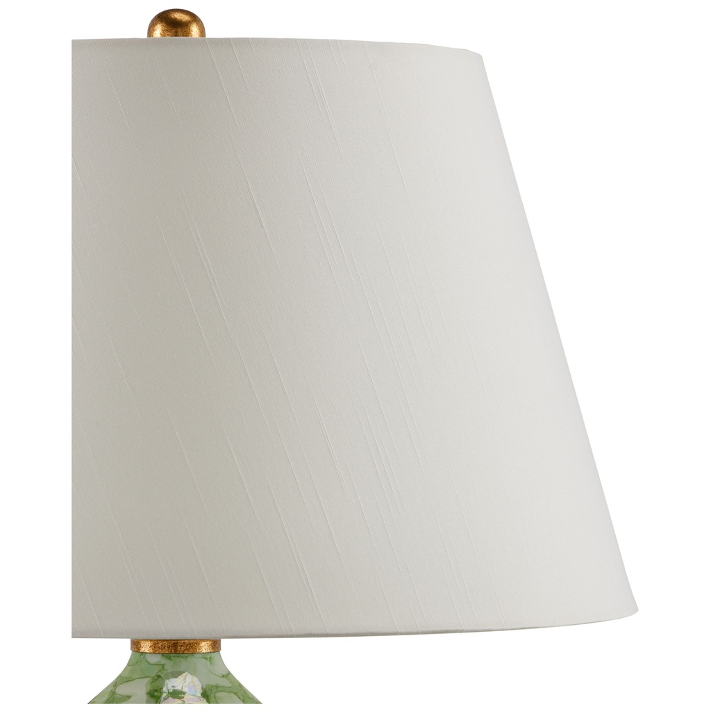 The shade is proportioned to work in balance with the base—neither too wide nor too narrow. The fabric or glass diffuses light evenly, producing a warm, inviting glow well-suited for bedside, accent, or ambient lighting. The finishing details on the shade, including the spider and finial, reflect the same quality as the rest of the lamp.