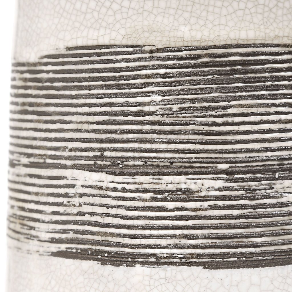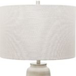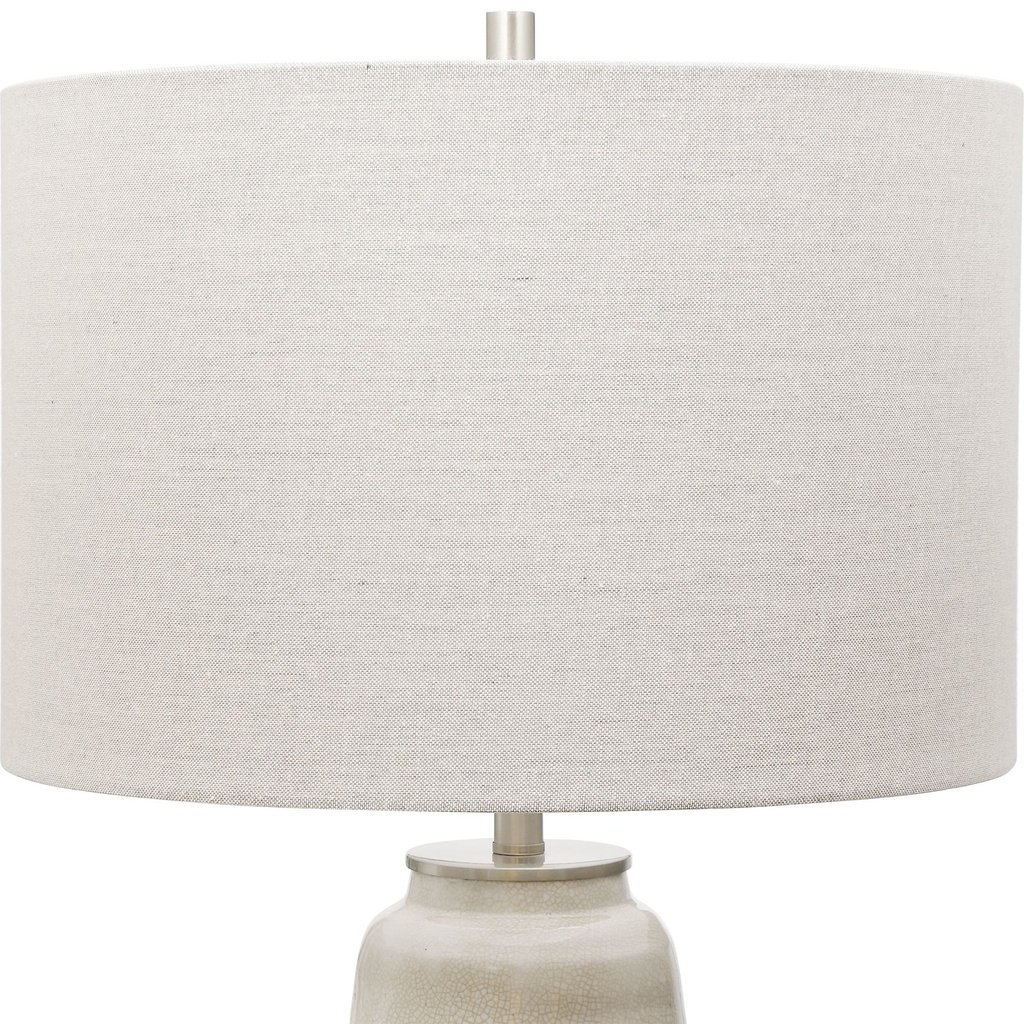Soft ivory. Ribbed texture. A crackle glaze that makes a 26.5-inch ceramic table lamp feel like something discovered rather than purchased. The Uttermost Comanche, designed by Osvaldo Mendoza, layers an off-white crackle glaze over a distressed rust brown finish on a tapered ceramic base — two finishes working in quiet concert to produce a surface that reads as simultaneously aged and refined. The ribbed texture travels the length of the tapered silhouette, catching light differently at every angle and giving the base a tactile depth that flat-glazed ceramics cannot approach. A round light gray linen hardback drum shade completes the composition with farmhouse restraint — neutral enough to disappear into the room, quality enough to be noticed. Mendoza’s signature is a livable design intelligence that makes the Comanche equally at home in a warm-toned living room and a cool, contemporary bedroom.
