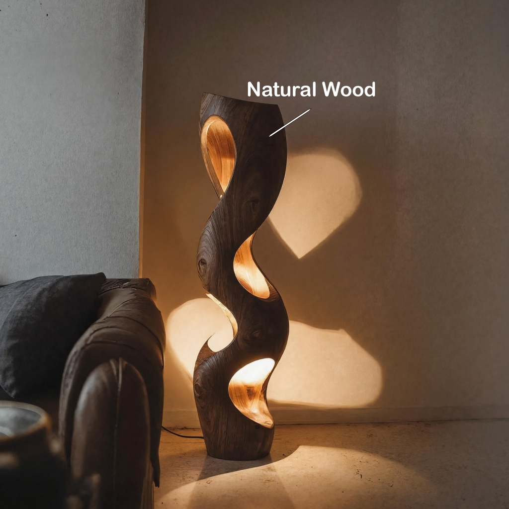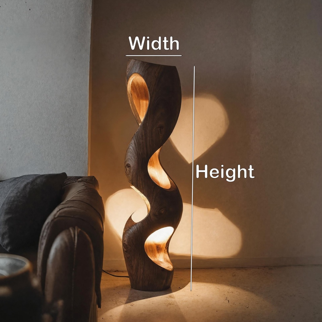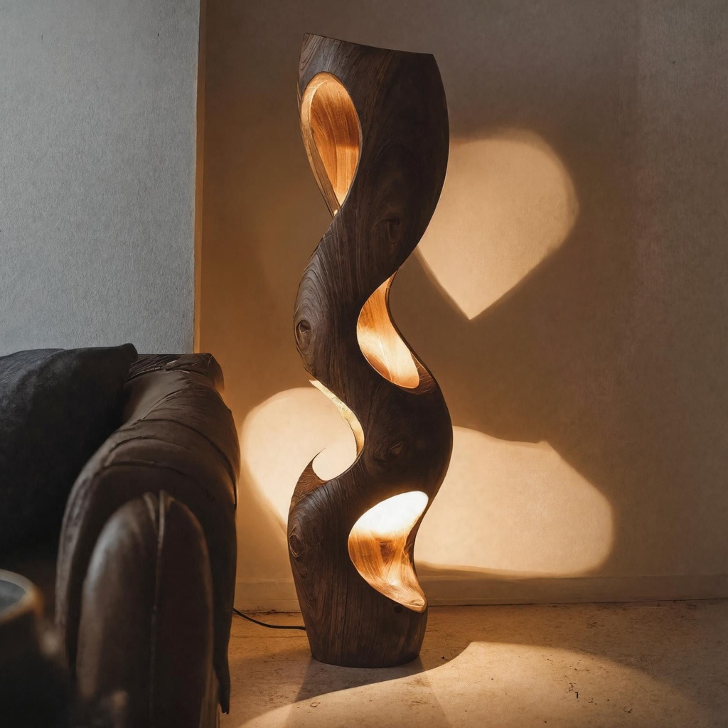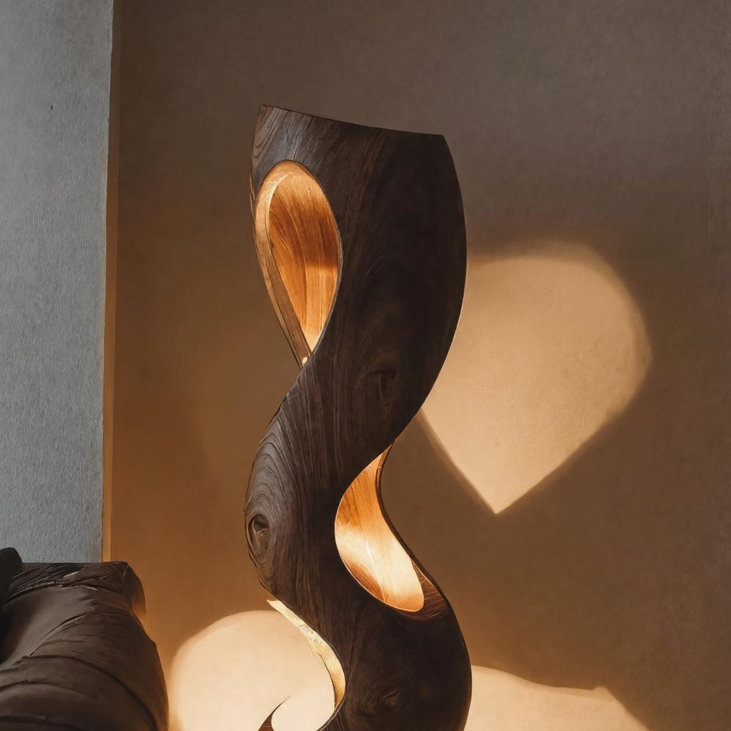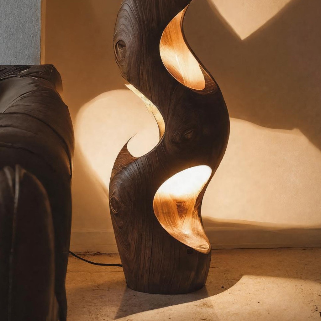 The lamp features a beautifully carved form with flowing curves and hollow sections, allowing light to spill through and cast gentle shadows. It’s more than just a lamp; it’s a piece of art that adds depth and character to your space. Its freestanding design ensures it can stand alone as a statement piece without overshadowing other furnishings.