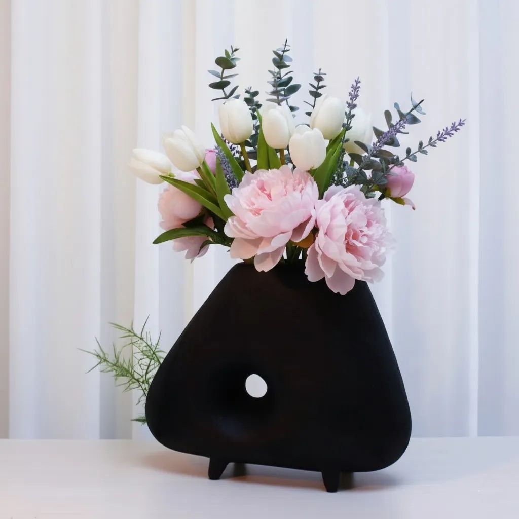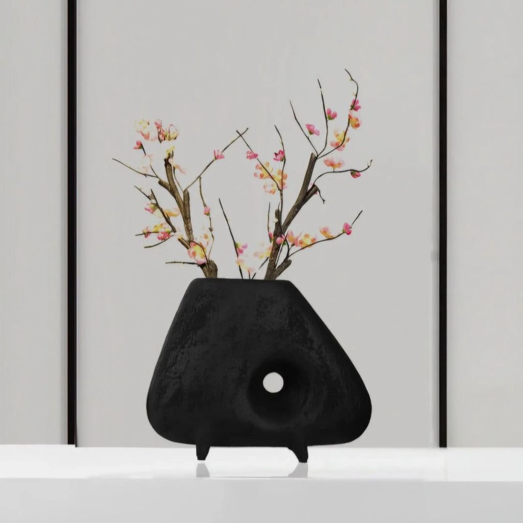 Fresh flowers, dried stems, and artificial botanicals all benefit from the open structure, which allows natural spread and visual volume. Left completely unfilled, the organic silhouette and central void function as a purely sculptural object with quiet artistic presence.