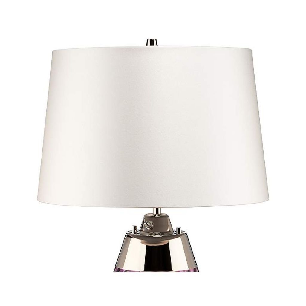 Polished nickel iron hardware runs through the neck and base fittings, offering a clean metallic contrast to the deep plum glass. The finish is bright without being flashy, keeping the lamp feeling refined and cohesive.