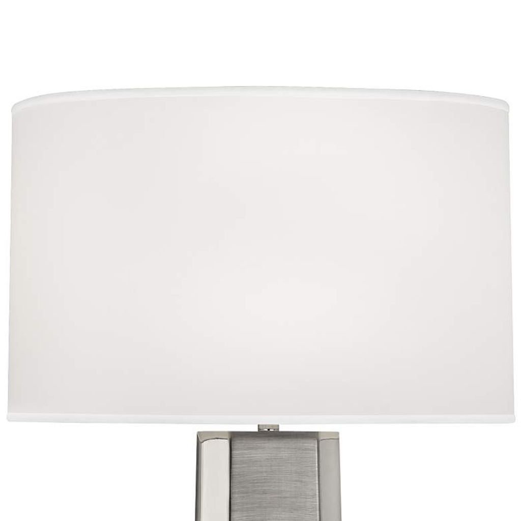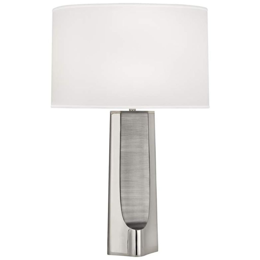 Most table lamps light a room. The Margeaux from Robert Abbey reshapes it. The steel base is finished in polished nickel with matte nickel accents — two versions of the same metal applied with deliberate contrast, one reflective and one absorbed, creating a surface that shifts between glamour and restraint depending on where the light falls. The concave form is the structural centerpiece — an inward curve pressed into the column that catches ambient light along its edges while deepening into shadow at its center, producing a three-dimensional play of tone and reflection that a straight column could never achieve. At 28 inches tall with a slender 6-inch base, this polished nickel table lamp carries contemporary elegance with architectural precision. A white organza oval shade — nearly 19 inches wide — diffuses light through its sheer organza fabric with a soft luminosity that flatters both the nickel base and the room around it. A full range dimmer switch at the socket delivers continuous brightness control that no 3-way design can match.