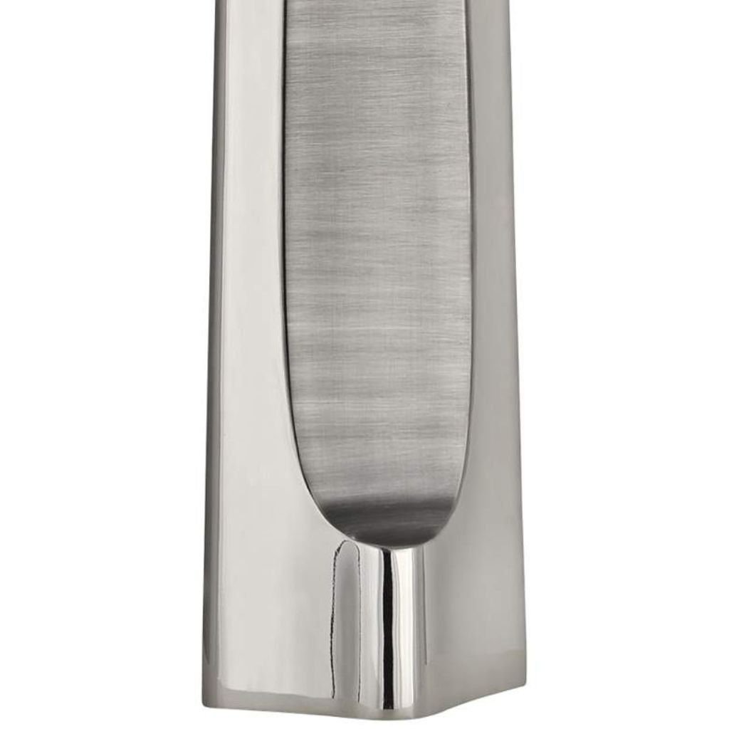 The concave form of the steel base is Robert Abbey’s signature move with the Margeaux — a single design decision that elevates what could be a straightforward nickel column into a genuinely sculptural object. The inward curve creates a continuous interplay between polished and shadowed surfaces, the reflective nickel finish catching ambient light at the outer edges of the concavity while the center recedes into cooler, darker tone. Matte nickel accents are applied at key hardware points — fittings, neck, and base — their non-reflective surface providing deliberate contrast to the polished column above, preventing the all-nickel composition from reading as flat or monotonous. The white organza oval shade is a sophisticated material choice at this price point — sheer enough to glow from within rather than simply diffusing light, its oval profile adding a softness to the lamp’s otherwise precise, geometric sensibility.