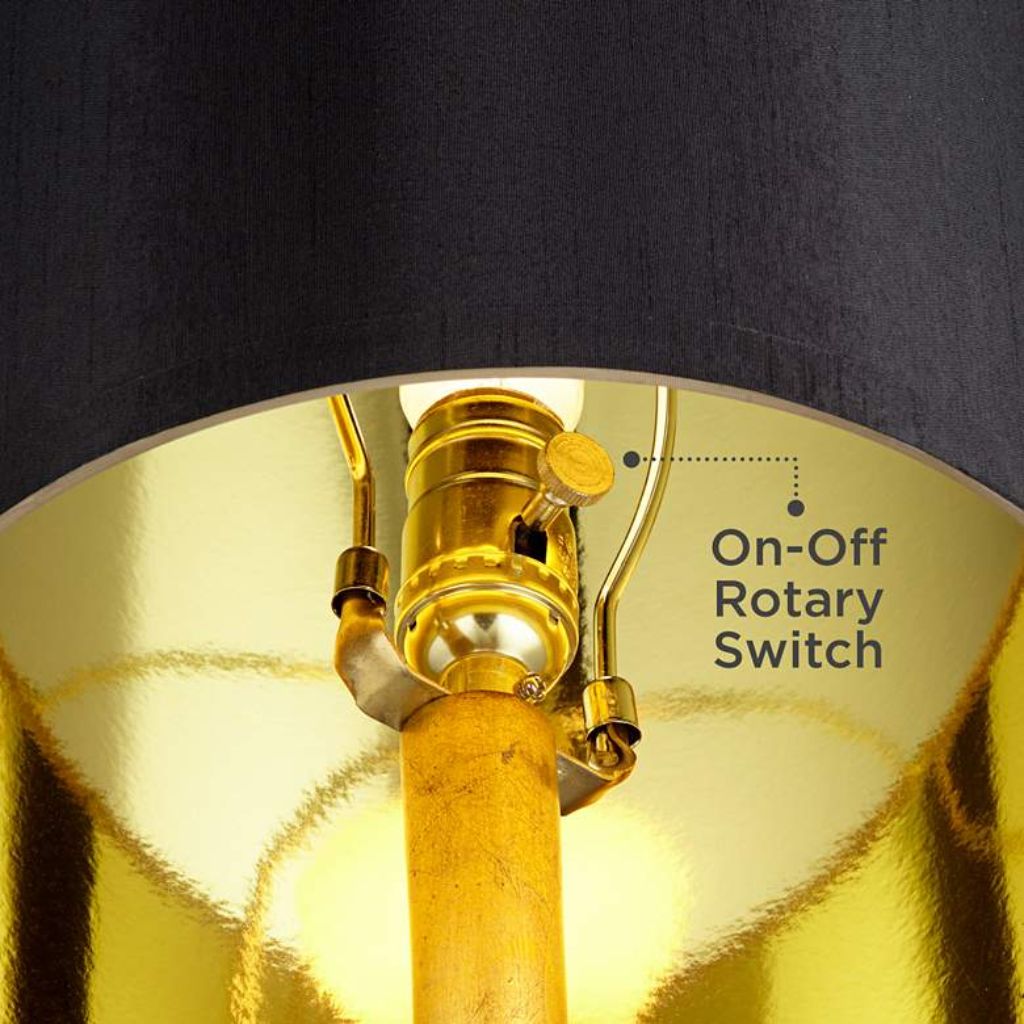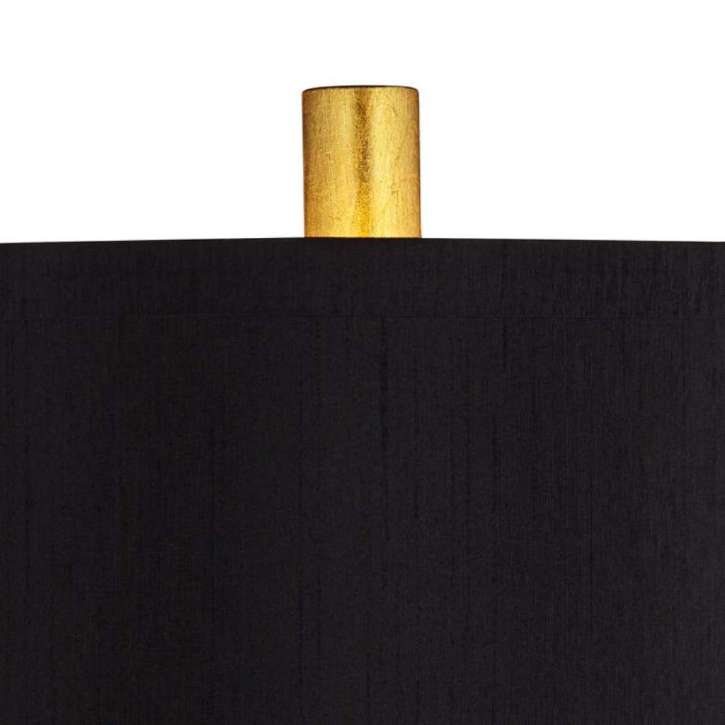 The black drum shade diffuses light softly while highlighting the sculptural gold centerpiece, offering a balanced combination of functionality and decorative flair.