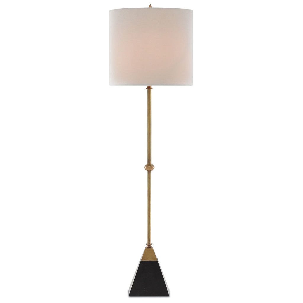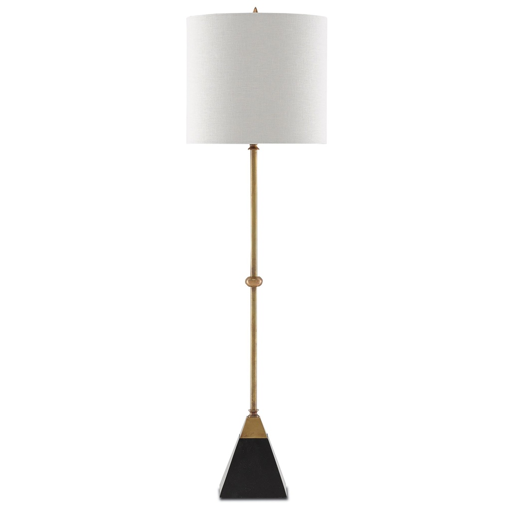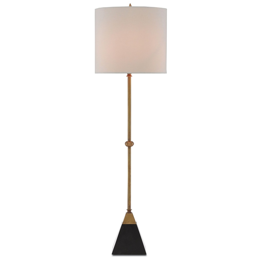 This tall, slender contemporary table lamp pairs a vintage brass finish with a tapered black granite base, creating a material contrast that is quietly sophisticated. The bone linen drum shade keeps the top portion light and neutral, and the in-line on-off cord switch is convenient for everyday use. At 35.5 inches tall, this brass table lamp is proportioned for use on a console, tall side table, or in a corner where height is an asset. The pairing of brass and granite suits both modern and transitional interiors.