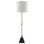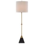 The tapered black granite base provides a grounded, heavyweight anchor for the tall brass stem above. The contrast between the dark stone and the warm brass creates a deliberate two-material story.