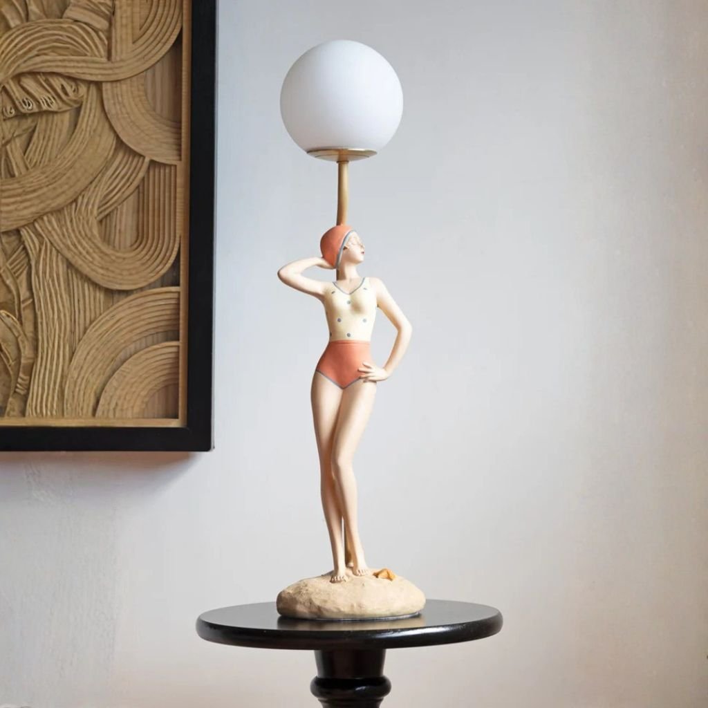 Built from resin and iron, this retro table lamp features a hand-painted bather figurine in a coral and cream swimsuit, standing on a sculpted sandy base complete with a tiny starfish detail. A gold-accented iron pole rises behind her to hold a clear glass globe, casting a warm, even glow with genuine vintage personality.