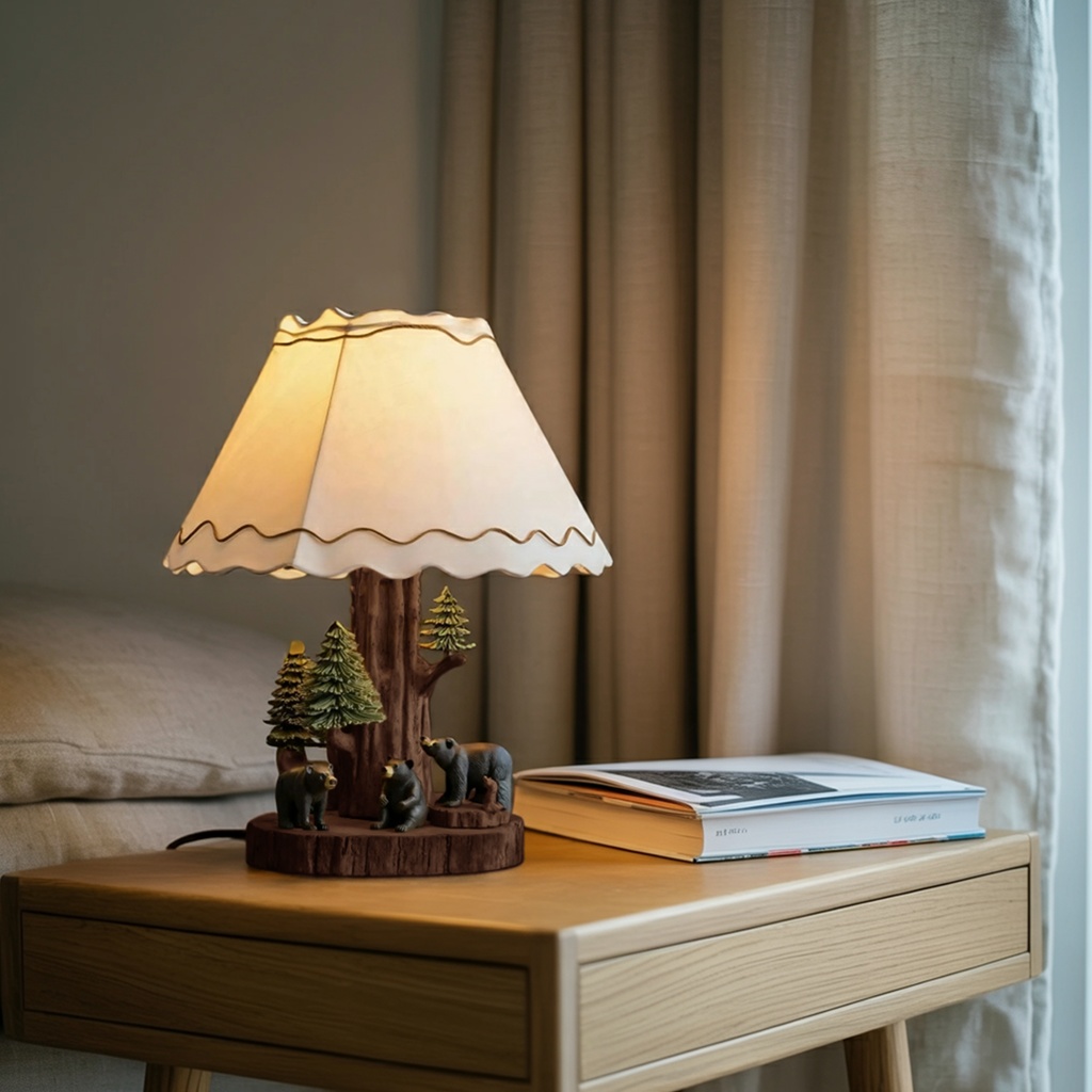 Step into a storybook with this lamp’s delightful forest scene. Miniature pine trees and curious bears explore their woodland home, creating a whimsical atmosphere. The hand-shaped details add character, while the soft glow from the lampshade casts a serene light. It’s a charming addition that brings nature’s tranquility indoors.