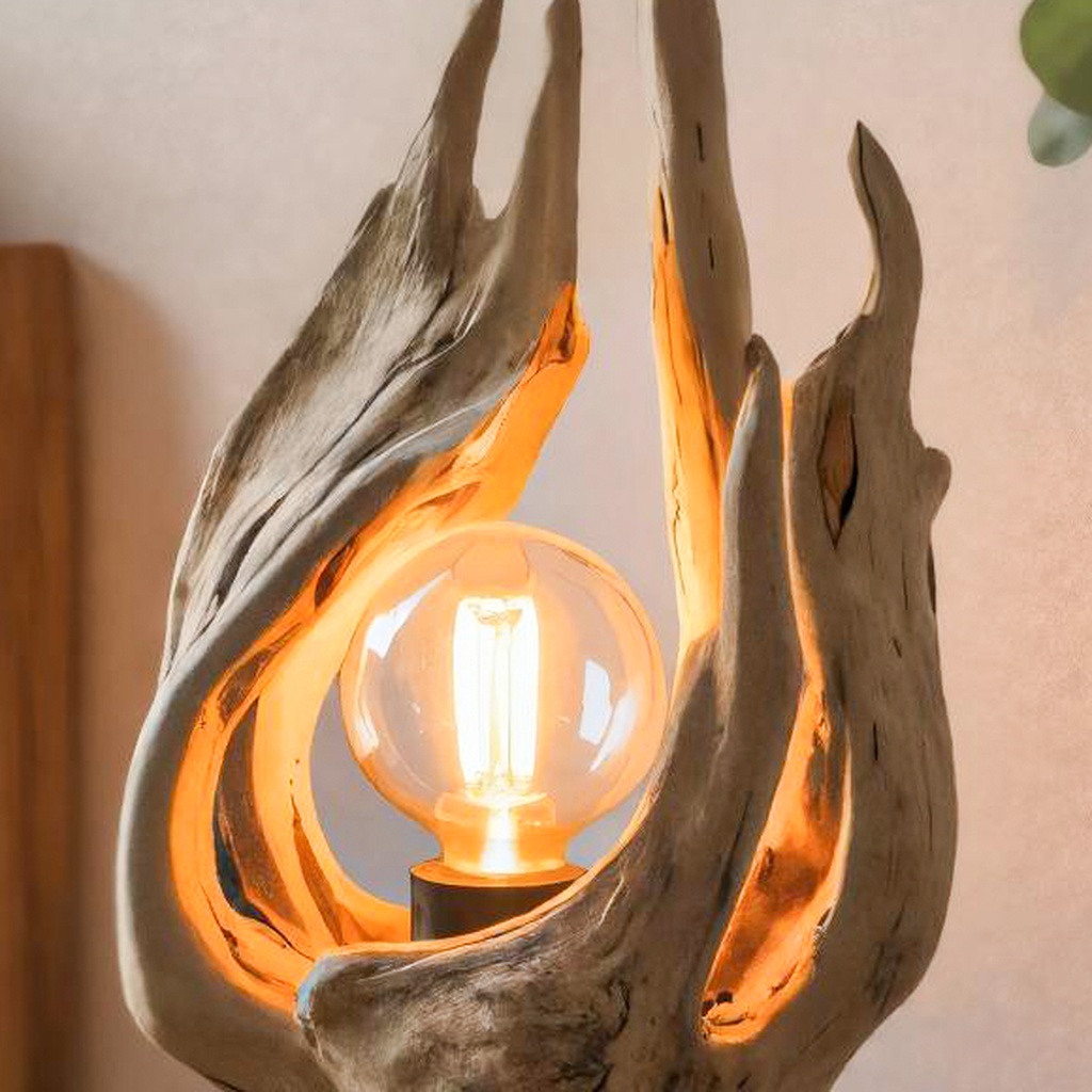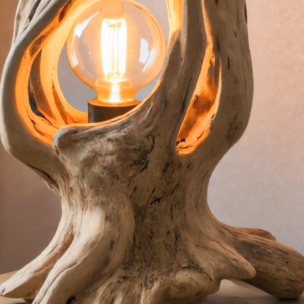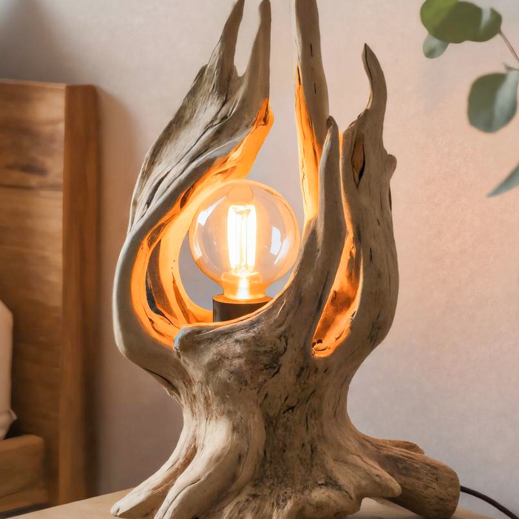This lamp is crafted from authentic driftwood, showing off its natural forms and textures. The exposed bulb not only enhances its rustic charm but also adds a hint of industrial style. When switched on, it fills the room with a warm and inviting glow, serving both as a light source and a decorative piece.
