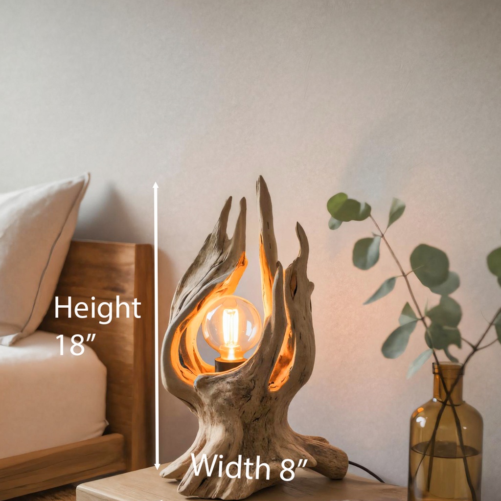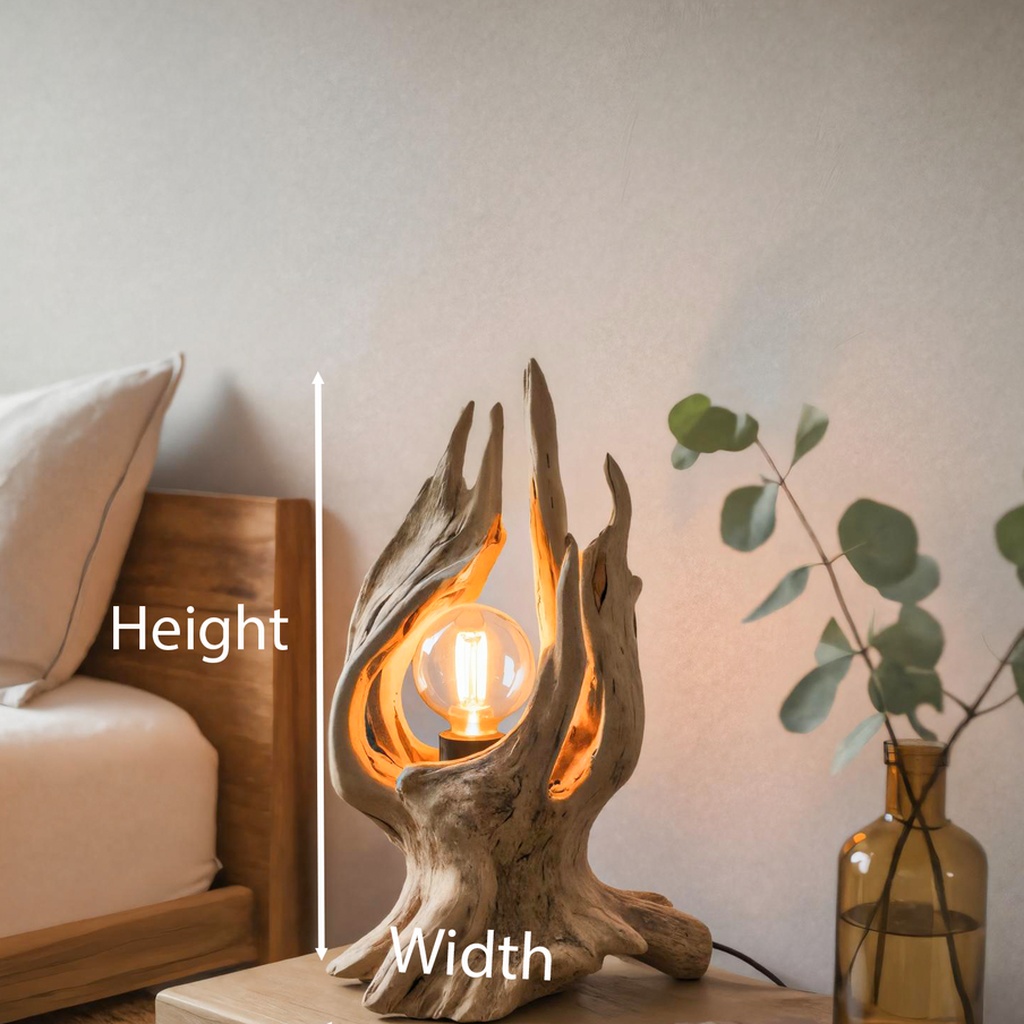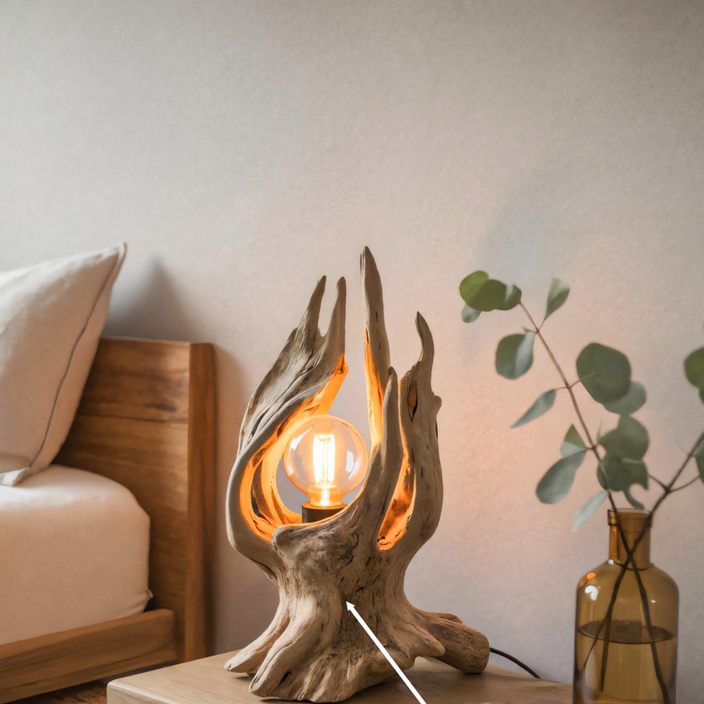 This lamp is crafted from authentic driftwood, showing off its natural forms and textures. The exposed bulb not only enhances its rustic charm but also adds a hint of industrial style. When switched on, it fills the room with a warm and inviting glow, serving both as a light source and a decorative piece.