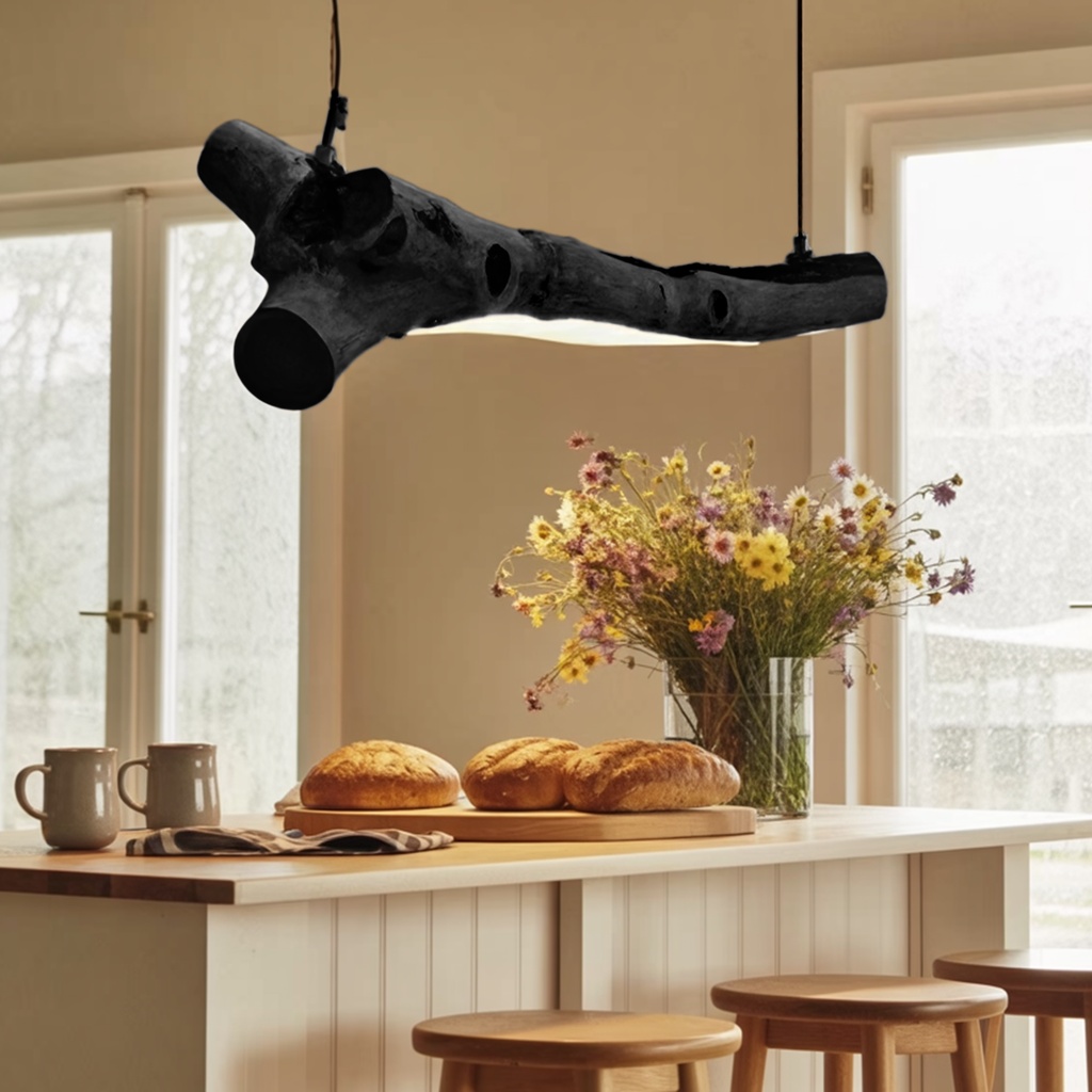 This chandelier captures the beauty of natural wood with its branch-like silhouette. Suspended on slender cables, it appears to float gracefully, casting a soft, even glow with integrated LED lighting along its underside. The branch’s raw contours and subtle knots give it a handcrafted feel, blending rustic charm with modern simplicity.