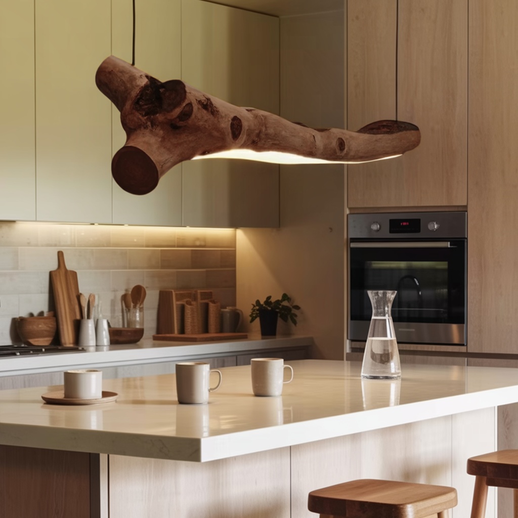 This chandelier mimics the beauty of nature with its branch-like silhouette. It hangs from thin cables, creating the illusion that the wood floats in mid-air. The integrated LED lighting underneath casts a gentle, even light over your dining table or kitchen island. The branch’s natural contours and knots add a handcrafted feel, while the sleek design keeps it looking fresh and modern.