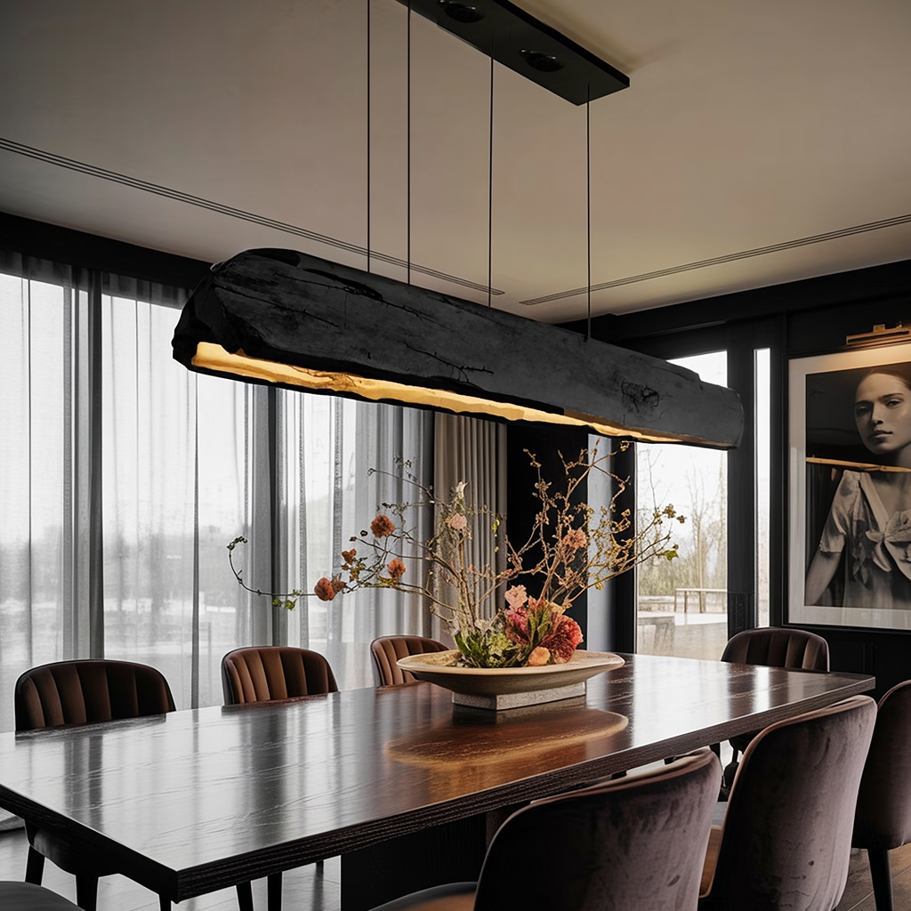 Imagine a solid log beam, elegantly suspended by sleek cables, floating over your kitchen island. This pendant light does just that, providing a gentle, welcoming glow that fills your space. Its organic shape and bold structure add character without taking over the room.
