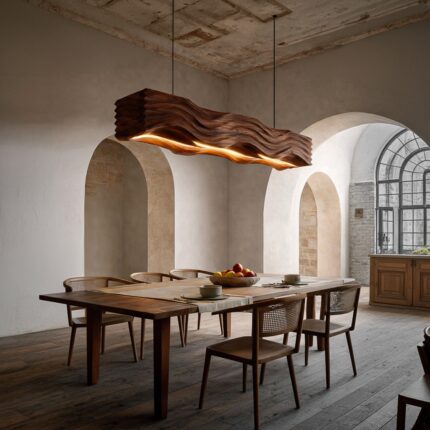The design features a solid walnut log beam that appears to float, thanks to its minimal cable suspension. It’s a striking piece that provides soft illumination, perfect for creating a warm and welcoming space. The organic shape and bold presence add character without feeling overpowering.