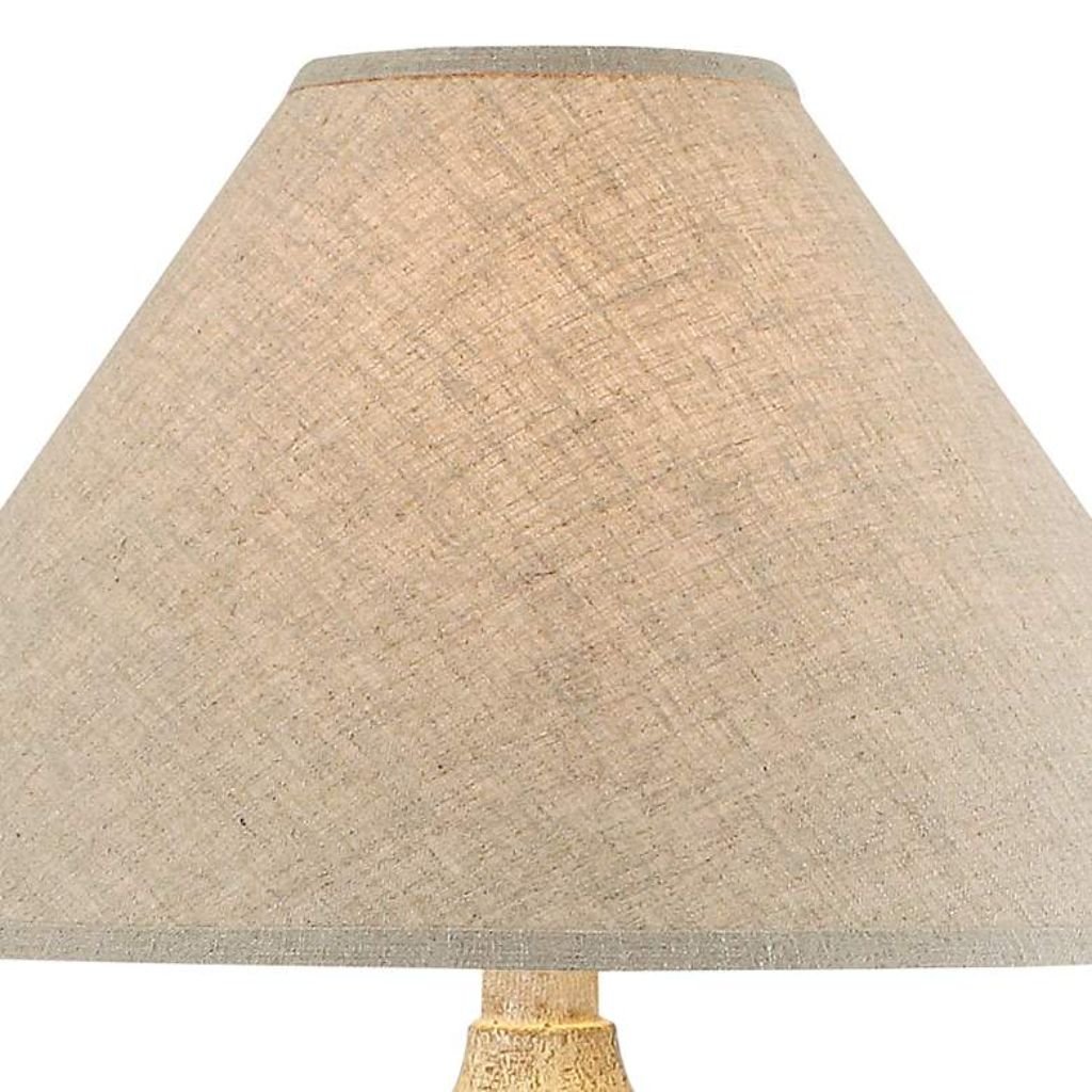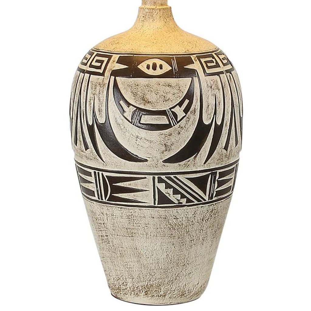The base is the visual anchor of this lamp — a tall vase silhouette with a Southwest-style relief pattern that wraps the cast plaster form in cultural texture. The rustic sand finish is layered to mimic the worn, sun-baked surfaces of Southwestern architecture, giving each curve and carved detail its own shadow and depth. The Empire profile shade is upholstered in a fabric that complements the base without competing with it — its neutral tone lets the base do the talking. The 6-foot clear cord keeps the look clean at floor level, threading away without interrupting the lamp’s profile.