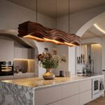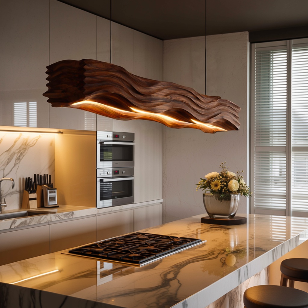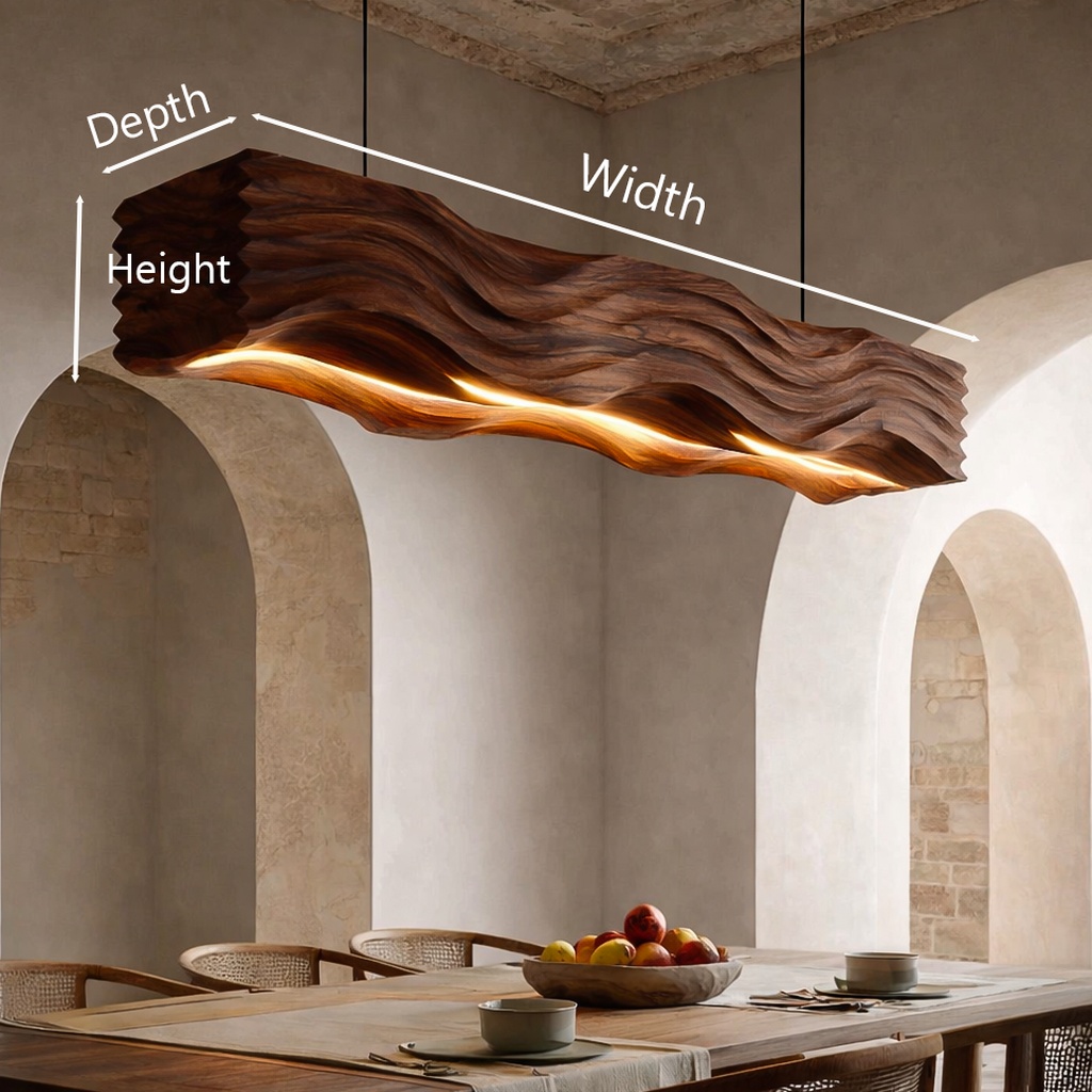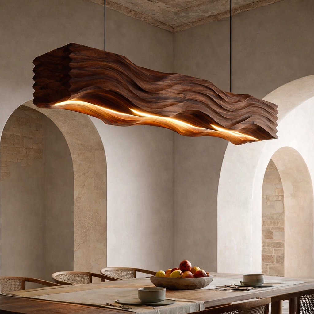 This lamp features a bold, elongated wooden form with deep wave carvings that catch the eye. The light gracefully follows the curves, casting a warm glow that highlights the unique texture and depth of the wood. With its slim suspension cables, it hangs elegantly without distraction, allowing the sculptural design to shine as the centerpiece.