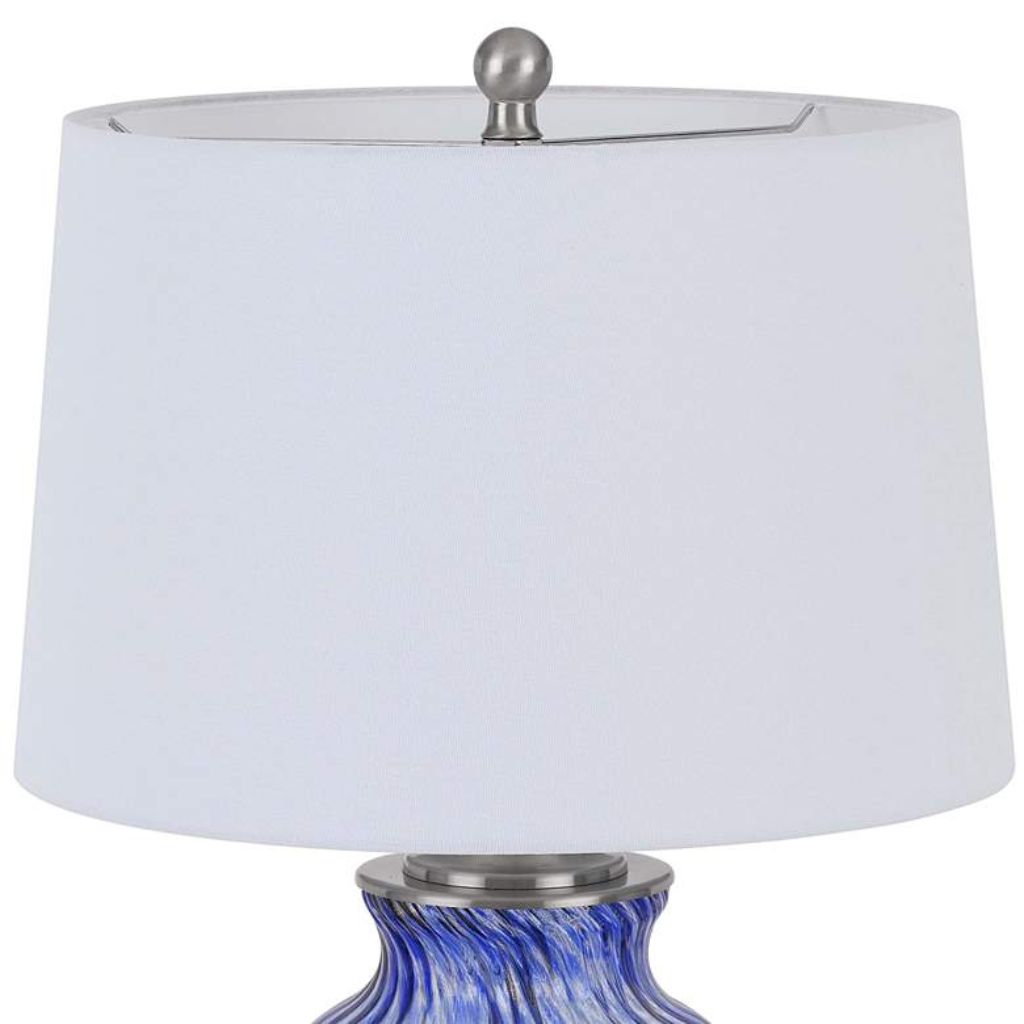 - Color/Finish: Sky blue glass, brushed steel frame and finial, white linen shade