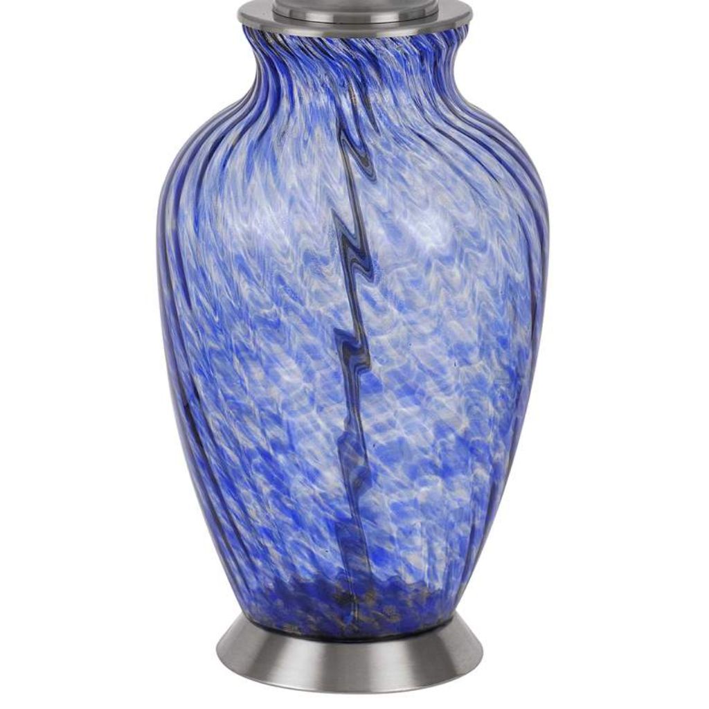 Hand-blown glass gives this art glass lamp its most compelling quality — a sky blue body with subtle color and pattern variation that makes each piece genuinely unique. The jar silhouette is classic and grounded, while the brushed steel frame and white linen shade keep the overall look clean and contemporary.