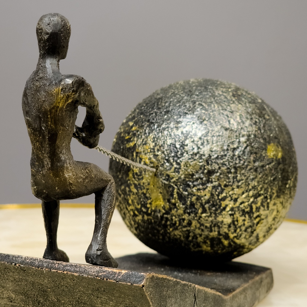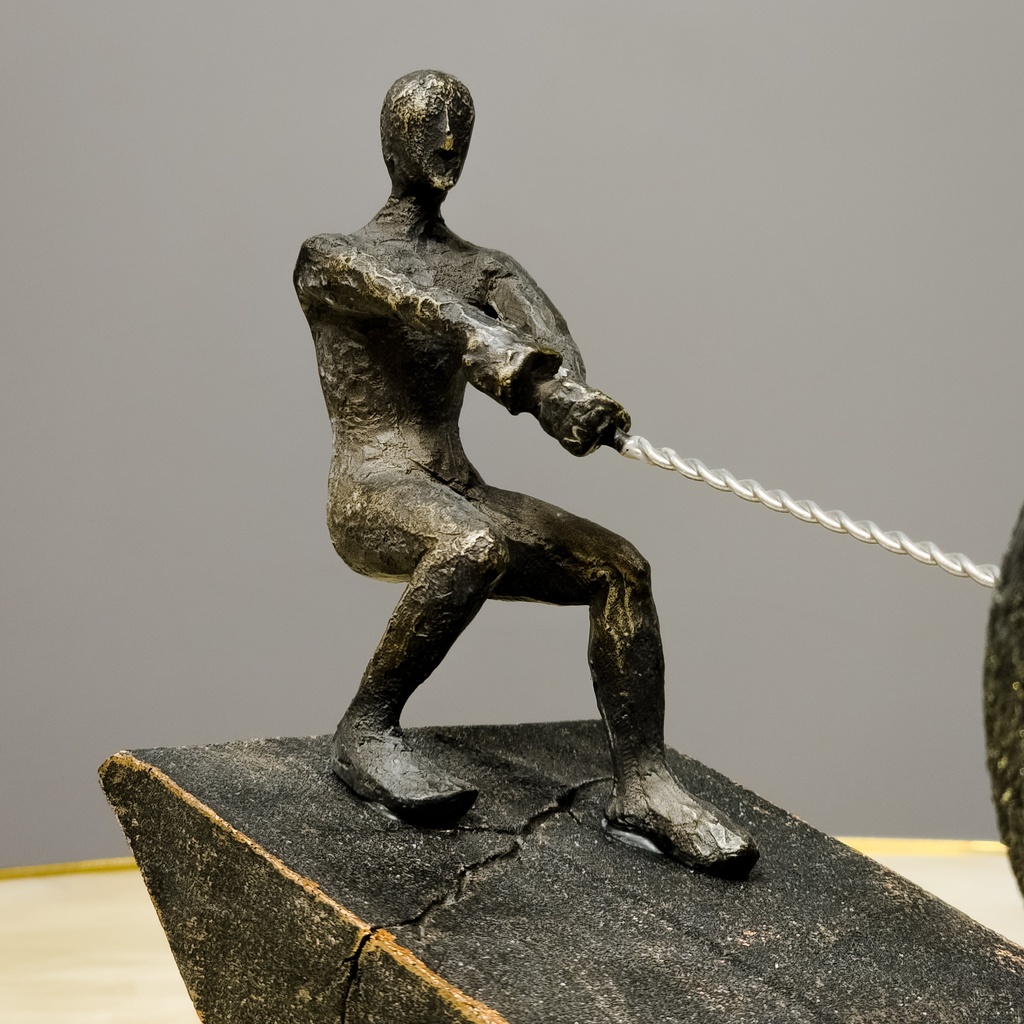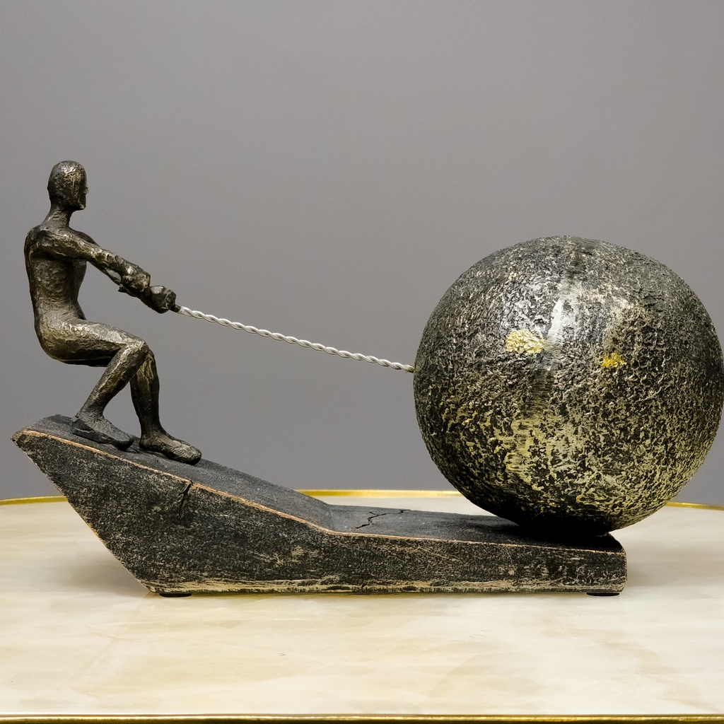 This sculpture captures a powerful moment—a human figure pulling a massive sphere up a rugged incline. The bronze finish and textured details bring the scene to life, highlighting themes of struggle, strength, and success. It’s perfect for anyone who values perseverance and hard work, whether in a home library or a corporate office.