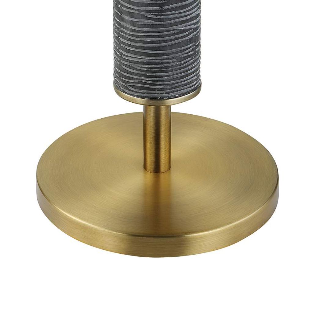 This floor lamp features a striking cylindrical silhouette accented by a carved base finished in rustic gray-black tones. The textured detailing adds depth and visual interest, making the lamp a natural focal point in modern, rustic, or transitional interiors. Plated antique brass accents over solid iron details introduce a touch of warmth and sophistication, balancing the darker finish with subtle metallic contrast.