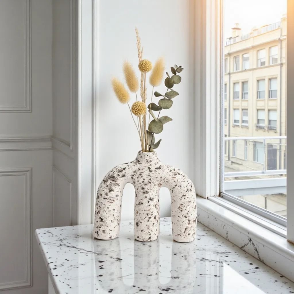 The design here is straightforward — a continuous arched silhouette paired with a softly textured surface that brings quiet architectural presence to any shelf or console. This ceramic vase is built around a looped form that reads as both sculptural and calm, making it easy to place in a modern interior without overthinking it. The natural stone finish ties it cleanly to the ceramic body.