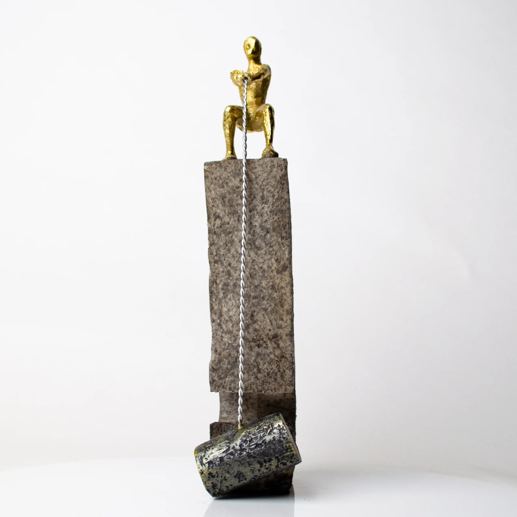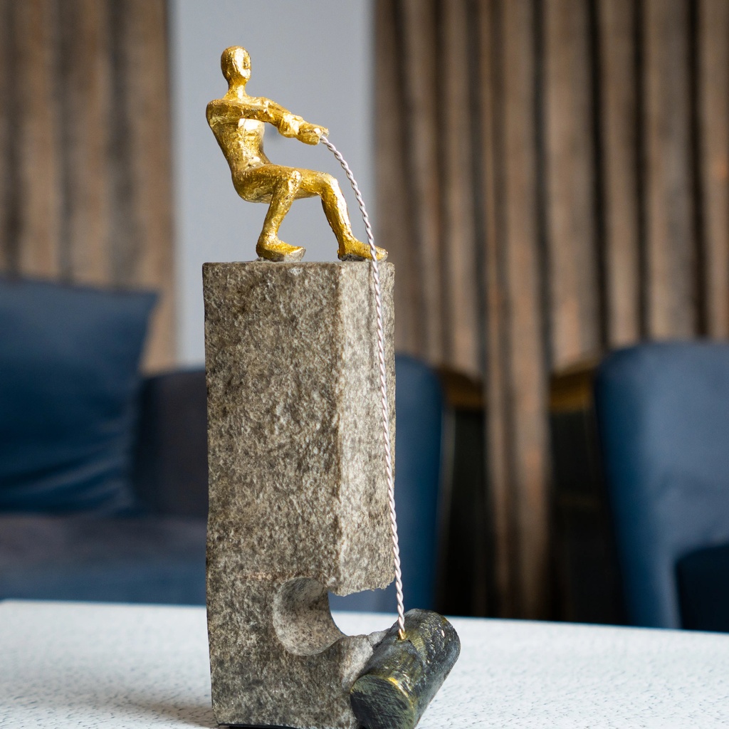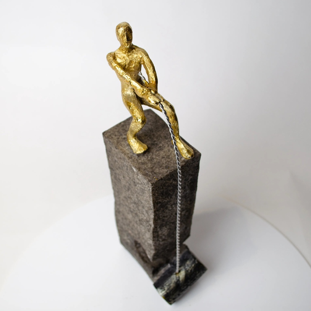 This figurine beautifully captures the essence of pushing through life’s challenges. With a golden-toned figure pulling on a metal rope, it stands tall on a textured charcoal pedestal. Every element, from the figure’s posture to the tension in the rope, is crafted to evoke strength and resilience. It’s an art piece that not only decorates but also motivates.