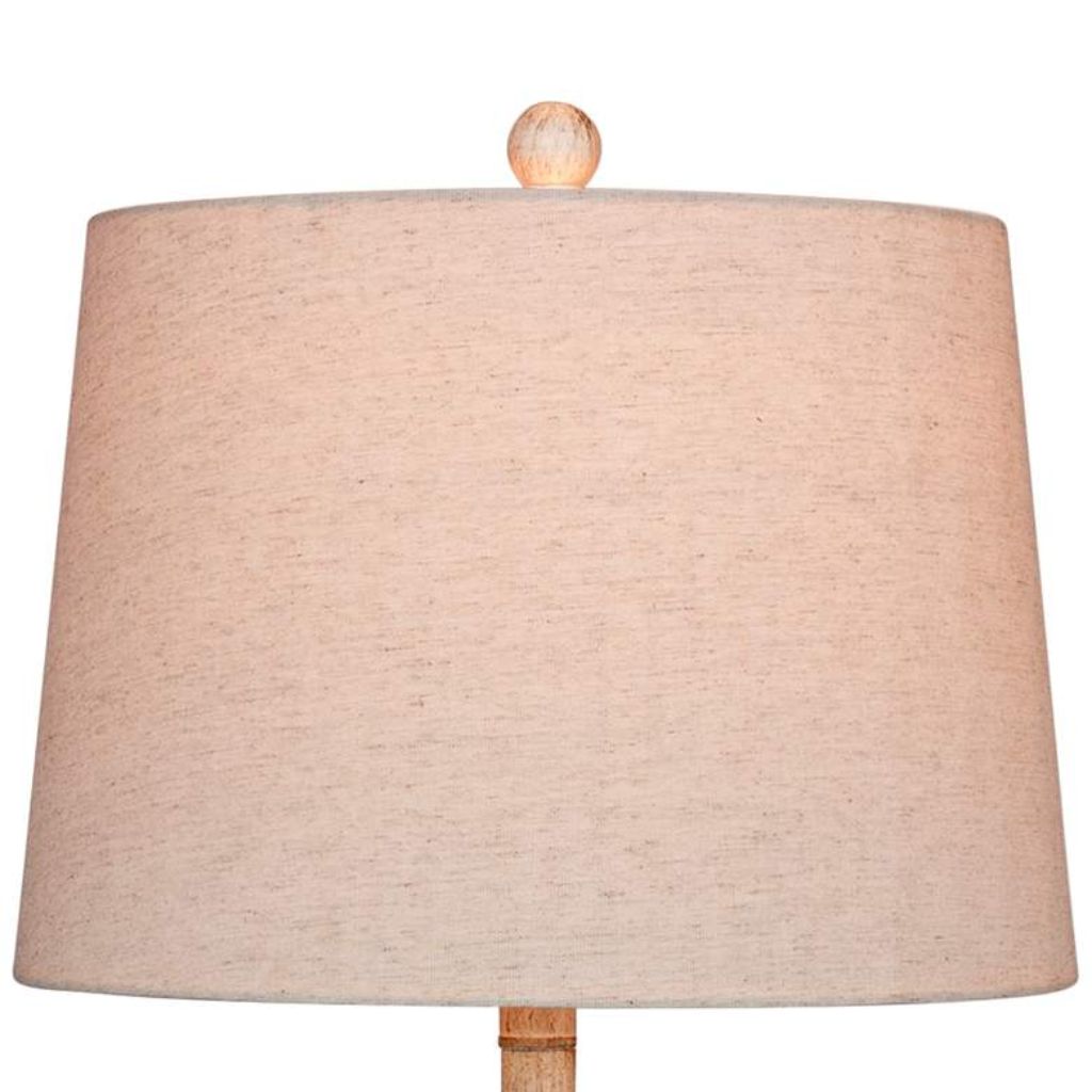 The palm leaf detailing on the cast resin base is the defining characteristic of this lamp — and the execution matters. Each frond is sculpted with dimensional relief, its surface rising from the base body with enough depth to cast its own shadow and create genuine tactile interest. The antique white finish is applied over the relief work rather than obscuring it, allowing the sculpted edges and surface variation of each palm leaf to remain fully legible. Cast resin construction allows for this level of decorative detail at a consistency and durability that hand-carved alternatives cannot match. The cream linen tapered drum shade reinforces the lamp’s coastal sensibility — its warm neutral tone and fabric construction adding softness above the more structured, sculptural base below.