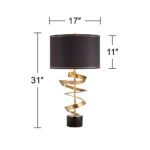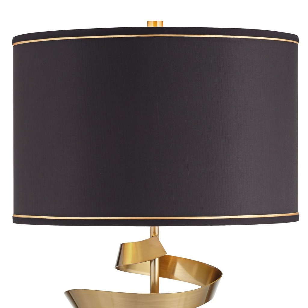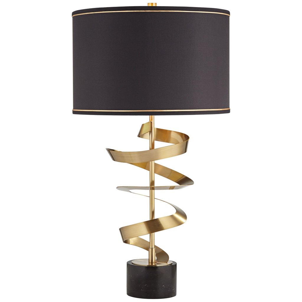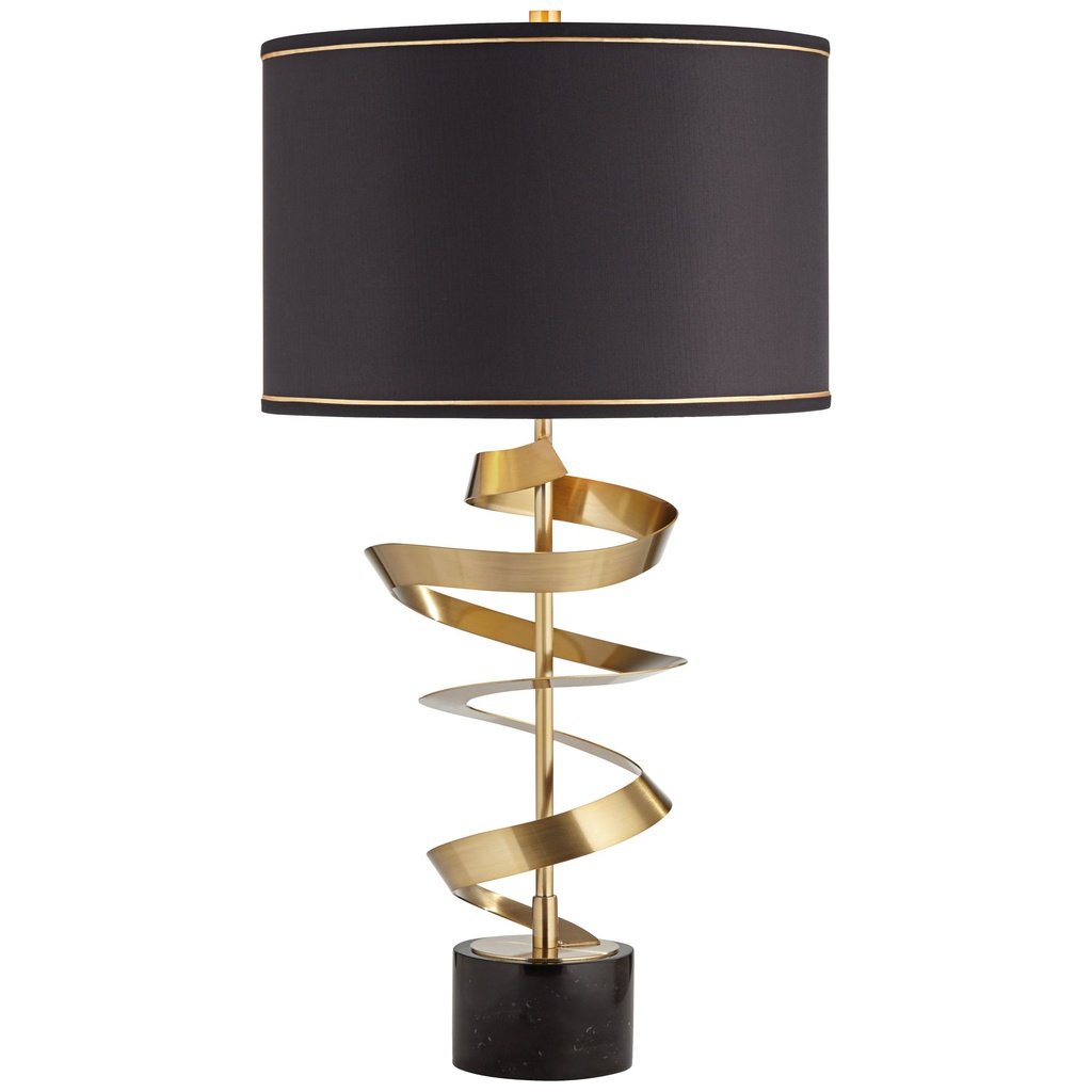 Marble and brass come together in this sculptural table lamp that reads more like an art object than a conventional light fixture. The ribbon-form brass twist rises from a real black marble base, creating a dynamic, kinetic silhouette that commands attention in a living room or conversation area. A black fabric drum shade with gold liner tops the design, and the full-range dimmer at the socket lets you control the sculptural lamp‘s ambiance precisely. Brass and marble are a timeless material pairing.
