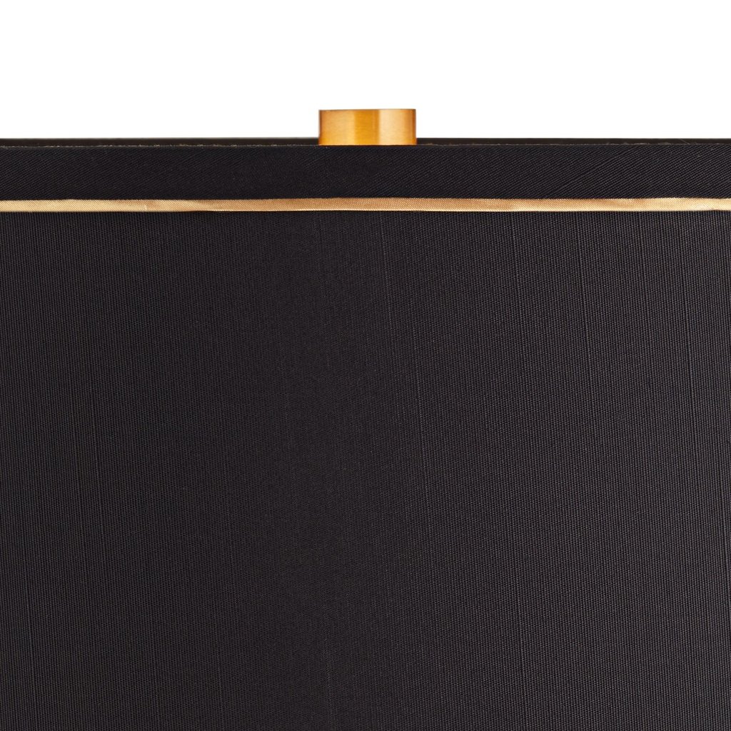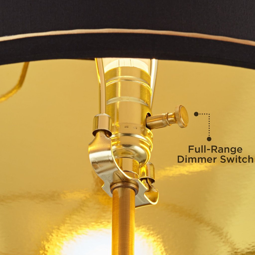 The black drum shade with a gold interior liner casts a warm, directional light that enhances the golden tone of the brass. The dark shade also makes the lamp suitable for both daytime display and evening use.
