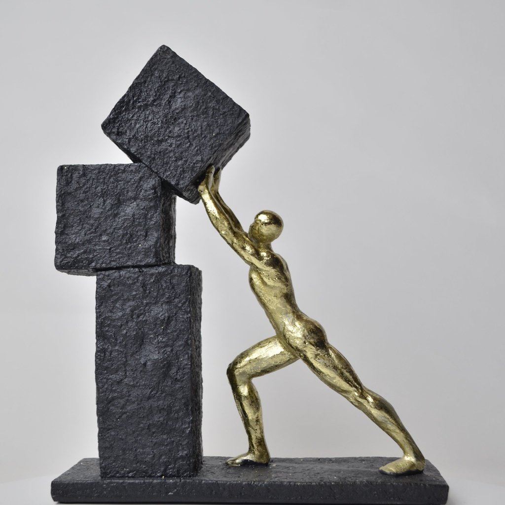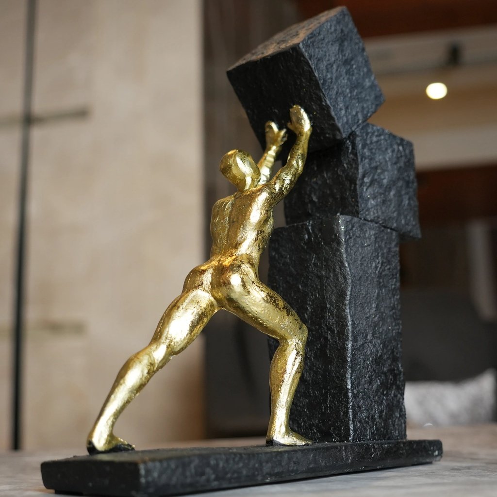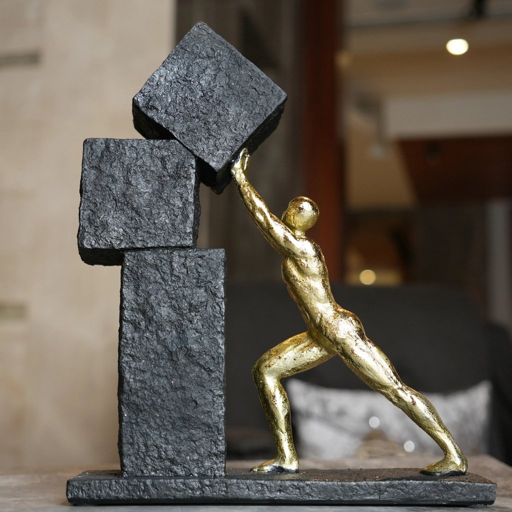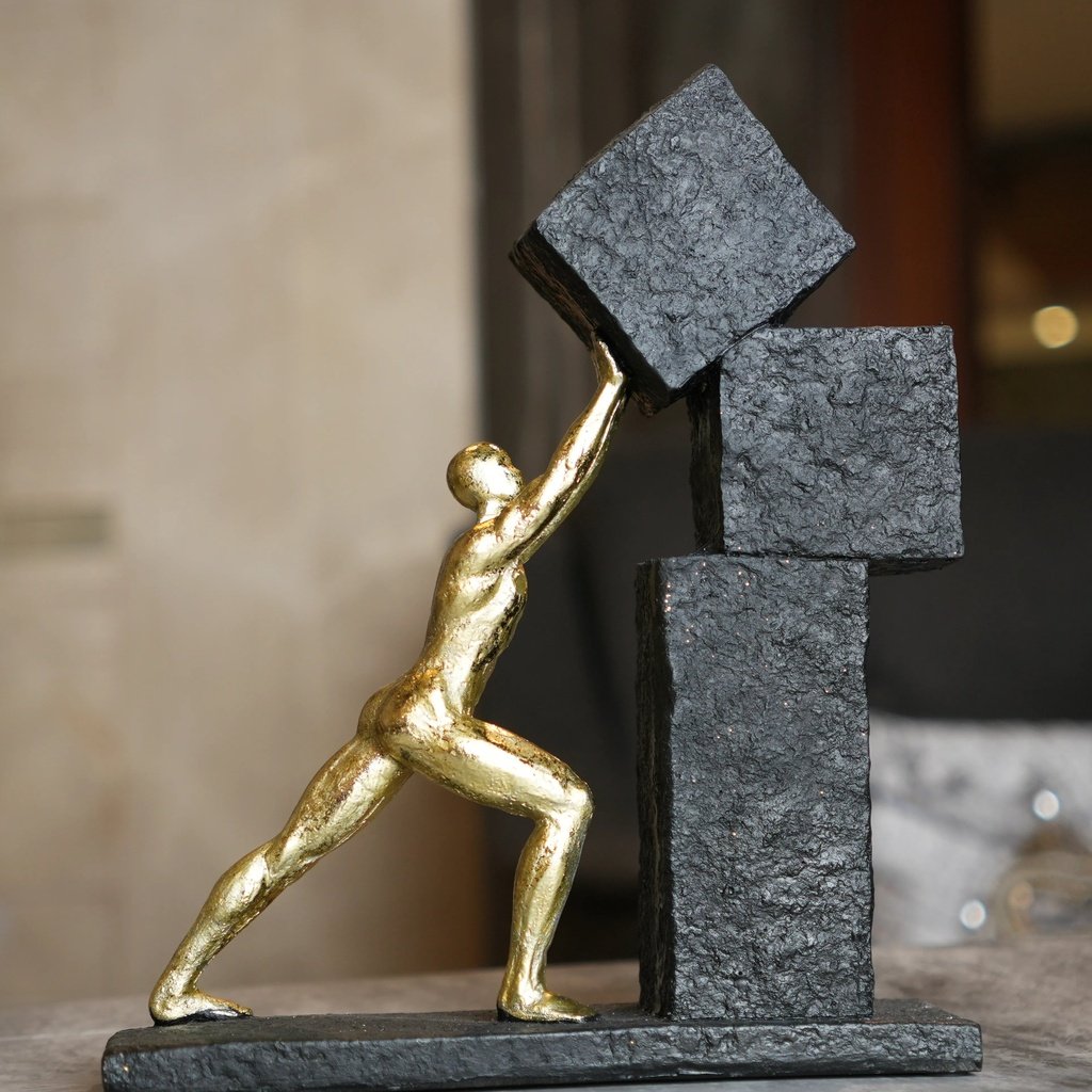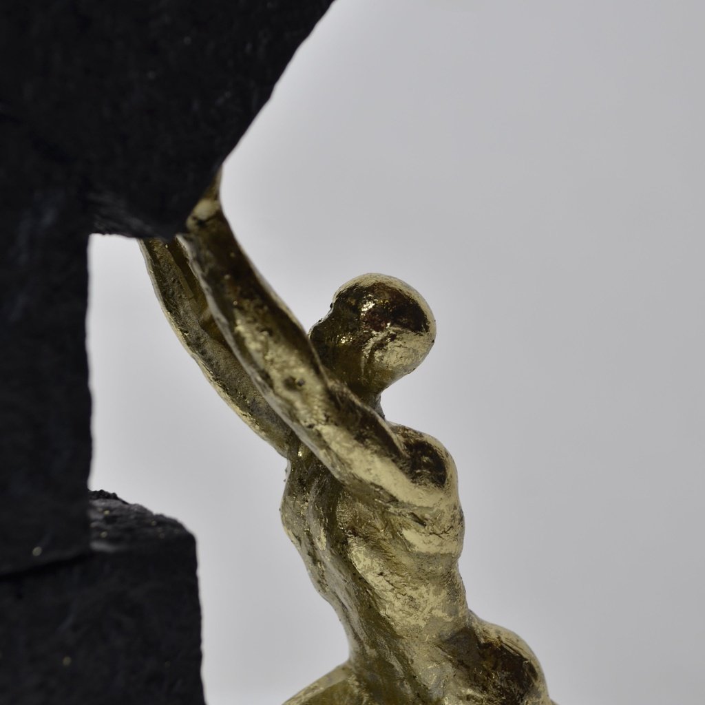 This figurine tells a powerful story through its design. The figure, in a rich gold finish, is seen pulling a heavy sphere upward, embodying the relentless journey of overcoming obstacles. The stone-textured base adds a sense of depth, representing the milestones and challenges one faces along the path to success. It’s a testament to human endurance and ambition.