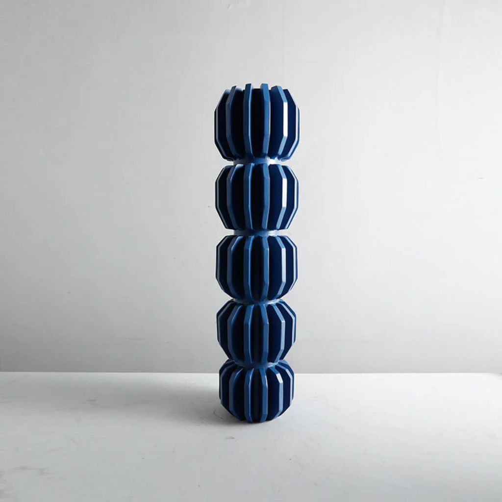 At 47cm tall, this totem vase is built around a stacked, segmented resin structure that draws directly from modernist totem forms — column-like, rhythmic, and architecturally confident. The repetitive geometry creates shifting depth and shadow as light moves across its surface, making it as much a sculptural object as a decorative vessel.