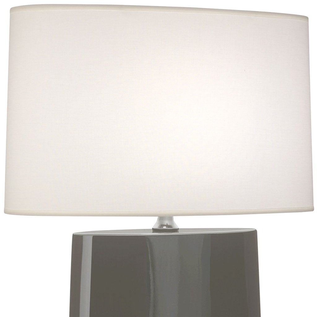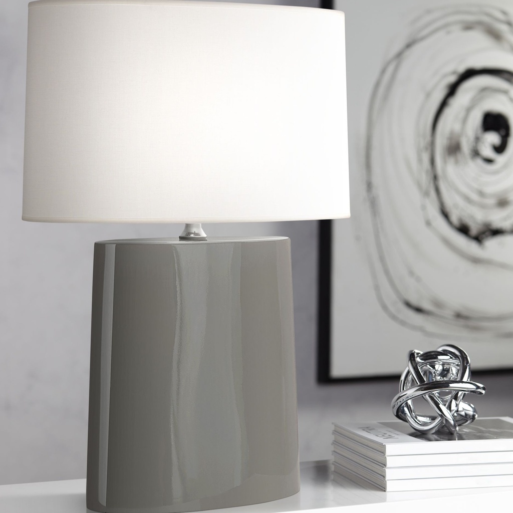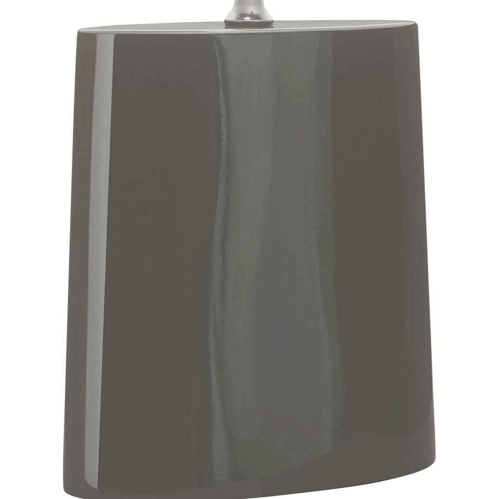The ash glaze on this ceramic table lamp produces a muted, slightly textured finish that is warm without being loud. The wide oval base gives it a stable, grounded presence on a dresser or console, and the Ascot white fabric oval lampshade complements the natural tones of the glaze. It is a ceramic lamp that works easily in contemporary, Japandi, or minimalist interiors.