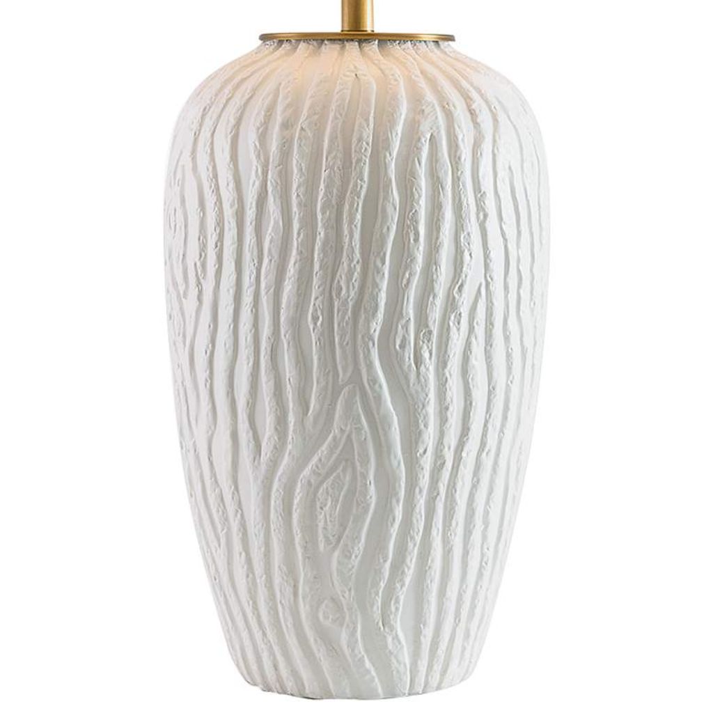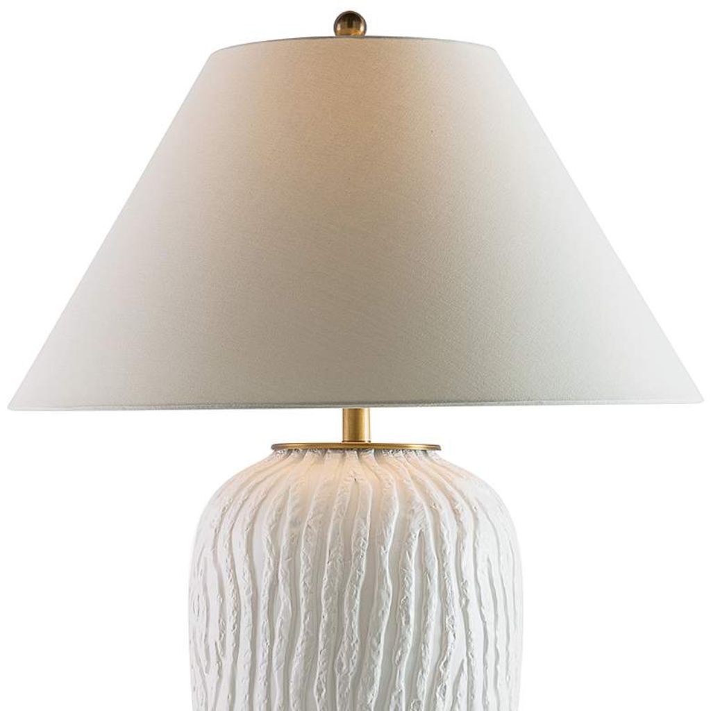 Soft white. Structured grain. A surface that reads as wood and reveals itself as something far more refined upon closer inspection. The Montana by Port 68 is built from handcrafted porcelain finished in a matte white glaze over a faux bois texture — the grain of wood pressed into the ceramic form before firing, then sealed beneath a glaze that transforms a rustic material reference into something unmistakably contemporary. The result is a base that bridges the gap between organic warmth and modern restraint with genuine material intelligence. A Lucite base lifts the porcelain column above the surface with transparent precision, its invisible support creating the impression that the textured white form floats above the table. Antiqued brass finish hardware and a brass ball finial thread warmth through the composition at its hardware points, grounding the cool matte white with metallic amber contrast. This textured porcelain table lamp stands 33 inches tall and is topped with a wide eggshell linen hardback cone shade — 24 inches across at the bottom — that delivers one of the most generous light spreads available in a table lamp of this height.