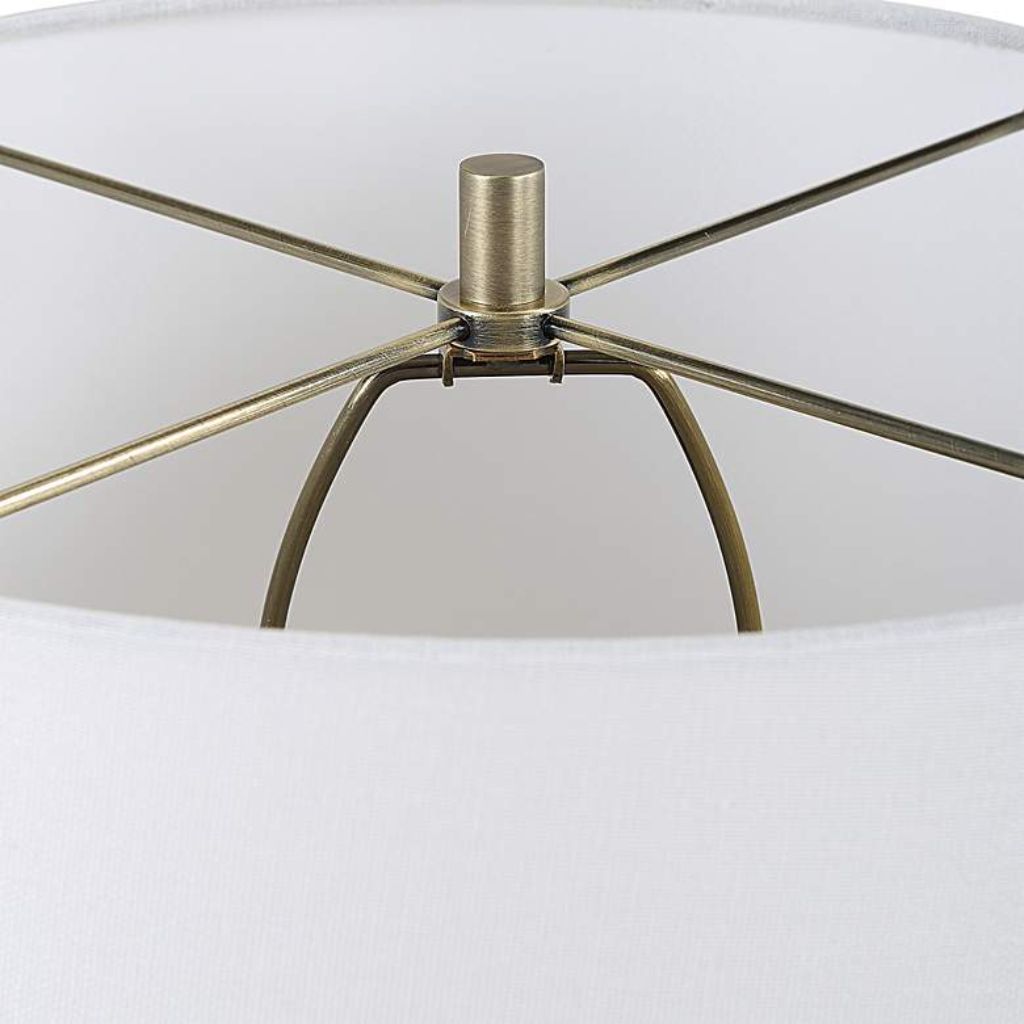 The tone-on-tone textured glaze is the Liora’s defining surface characteristic, and Uttermost applies it with the consistency that distinguishes a quality production piece from a decorative approximation. Tone-on-tone design — where texture and color share the same value — requires the textural relief to carry the entire visual interest of the surface without the aid of color contrast. The flowing design of the porcelain base provides the underlying form that makes this approach work — gentle curves and transitions that catch the textured glaze differently at each inflection point, keeping the white surface visually active without introducing color or pattern that might disrupt the lamp’s serene, monochromatic character. Brushed antique plated brass hardware at the neck and fittings provides the sole point of material contrast, its warm aged tone sitting against the white porcelain with a complementary tension that adds sophistication without complicating the lamp’s essential simplicity.