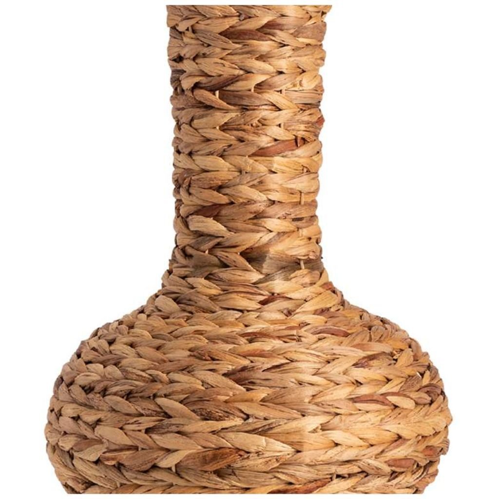 The hand-woven water hyacinth construction is what defines the Captiva Bay’s character, and the gourd silhouette chosen to showcase it is a deliberate and effective design decision. The gourd form — rounded and full at its widest point, narrowing toward the neck with organic fluidity — gives the woven fiber enough surface area and curvature to register as a truly three-dimensional textile object rather than a flat or cylindrical wrapping. Each strand of water hyacinth contributes to a surface that carries natural tonal variation from pale straw to deeper golden brown, the inherent color range of the plant fiber giving the base a warmth and depth that painted or glazed surfaces spend their entire production process trying to approximate. The wood-like quality of the finished construction adds a visual weight and seriousness that keeps the lamp grounded and intentional rather than purely decorative. The natural linen hardback drum shade maintains the all-natural material philosophy of the base, its clean edges and neutral tone closing the composition without interrupting it.